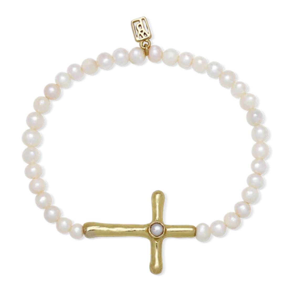 Our Poetic Cross embodies a central message of love and compassion, exemplified by a singular pearl cabochon in its center. Floating on a stretch string of pearls is a humble and beautiful meditation on triumph over death and the natural strength of becoming.