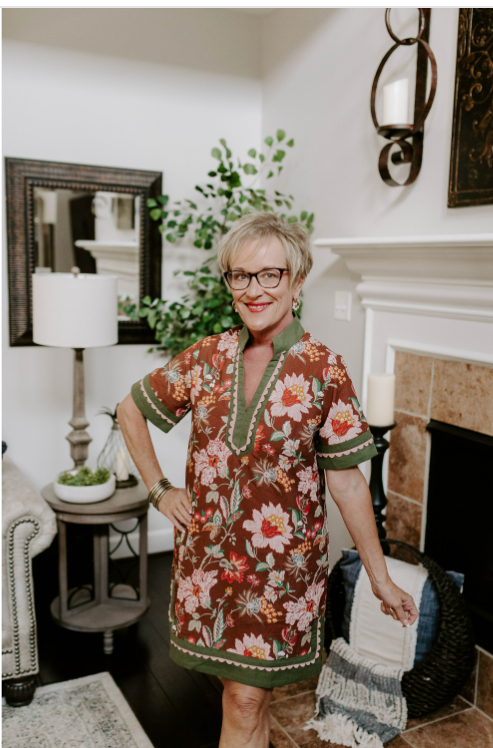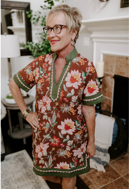 Step into playful charm with the Fall Ember Dress, a floral print mini dress that brings a fresh twist to your wardrobe. Featuring short sleeves and a unique caftan-inspired neck band in contrasting fabric, this lightweight woven dress is lined and non-sheer for comfortable wear. Practical side pockets add a fun, functional touch, making it perfect for sunny days and spontaneous adventures.
