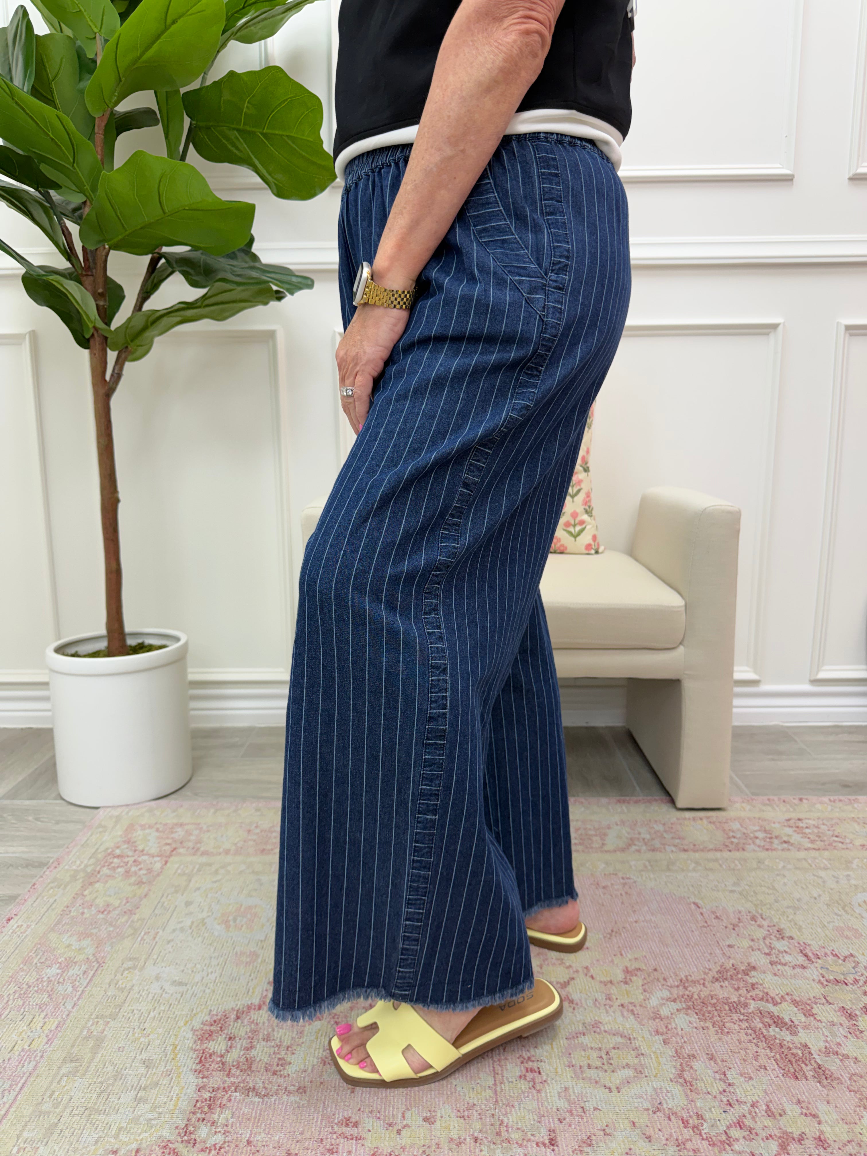 Stripes never go out of style—especially when they're paired with a silhouette that commands attention. These wide-leg pinstripe pants bring effortless sophistication with a fun twist. The relaxed fit skims your frame without clinging, while the classic pinstripe pattern adds visual interest to any outfit. Dress them up with a blazer for the office or keep it casual with a tee and sneakers. A versatile wardrobe essential that works as hard as you do.