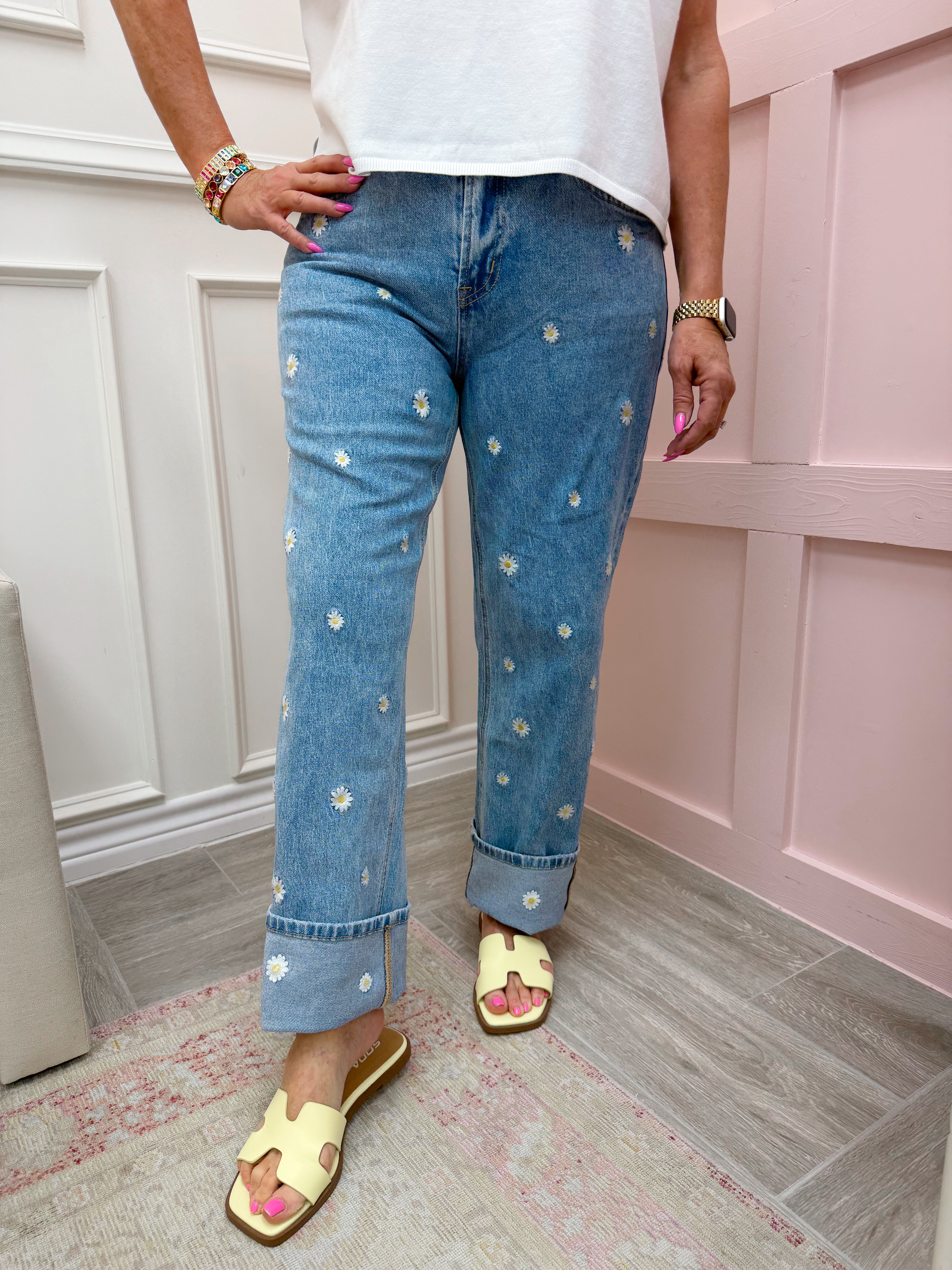 Mica Denim: High Rise Daisy Embroidered Jeans