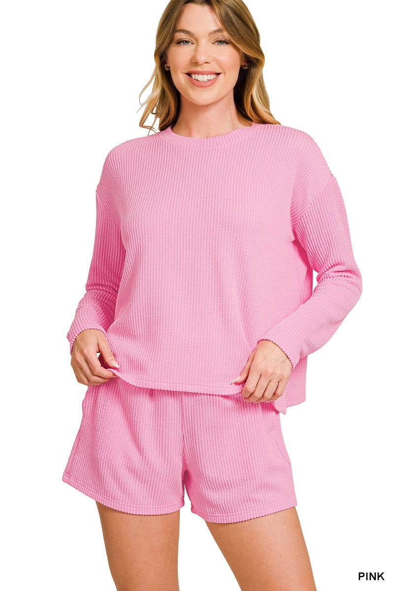 Get ready to conquer the day in the DOORBUSTER: Ready For Anything Set! This playful combo features a cozy raised rib long sleeve tee with a comfy round neck and matching shorts equipped with handy pockets for all your essentials. Perfect for lounging or on-the-go fun, this set pairs comfort and style effortlessly.