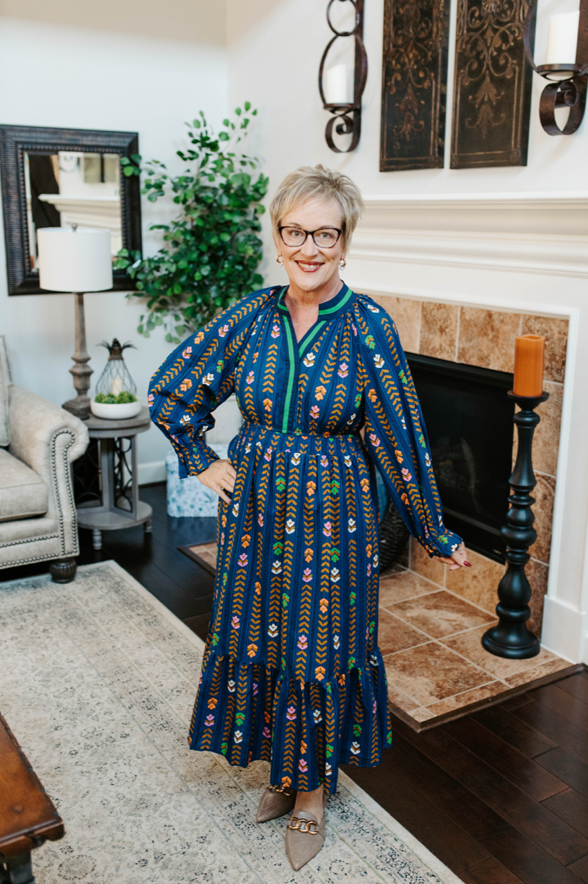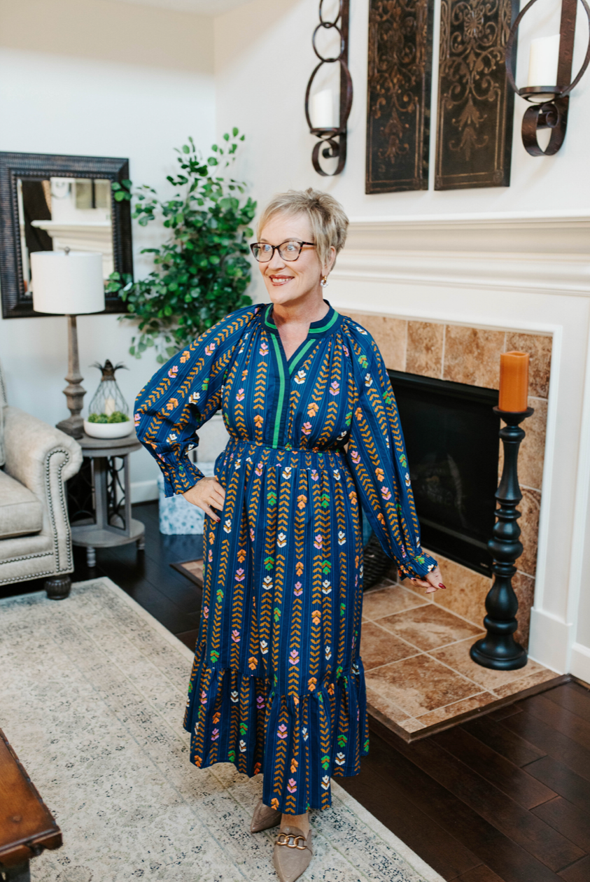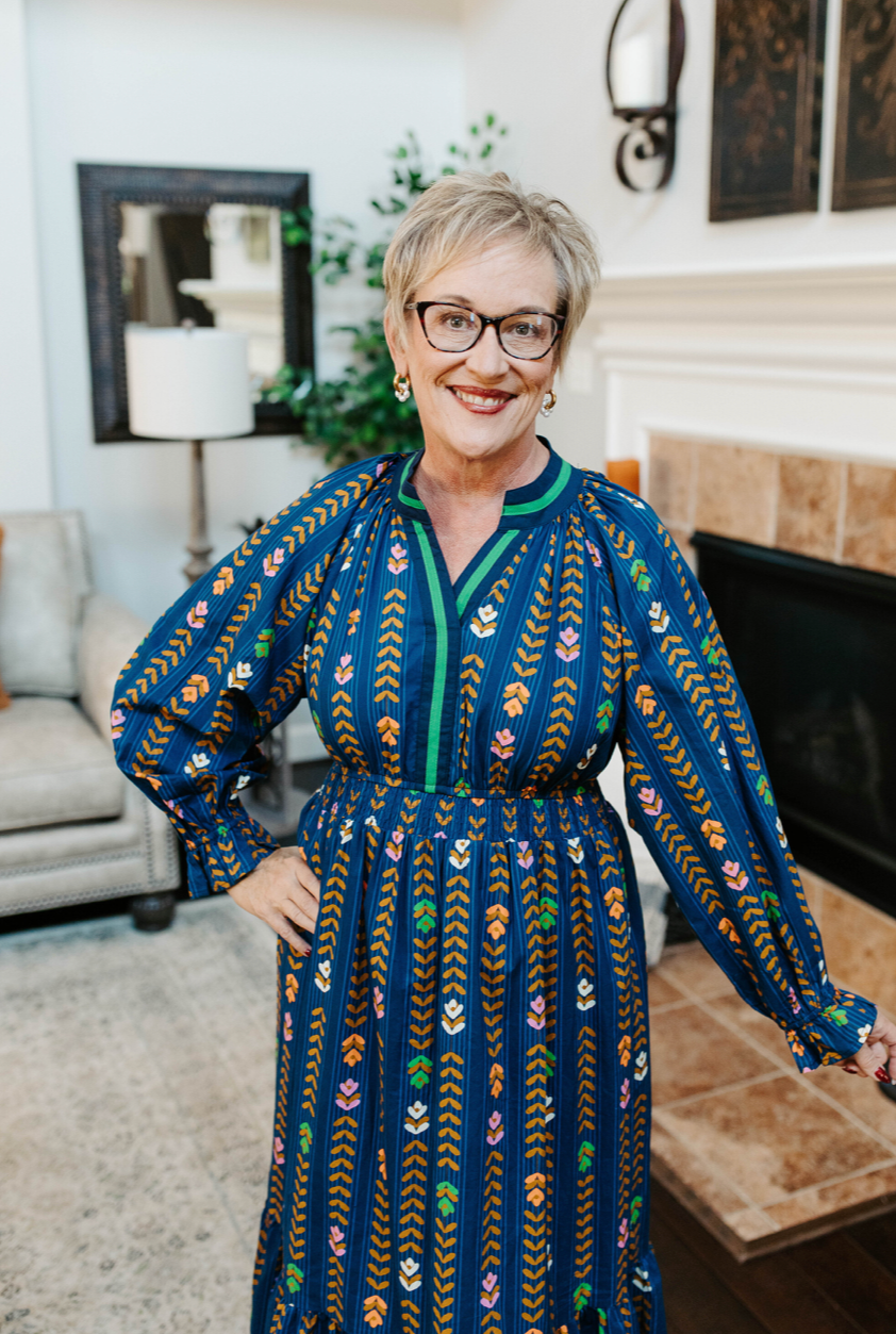 The Angelina Dress brings playful charm with its midi length and ruffled tiered hem that dances with every step. A smocked elastic waist enhances your silhouette, while long sleeves end in smocked ruffle cuffs adding a flirty touch. The V-split neckline features a contrast trim detail, making this dress a standout. Finished with a lined skirt for comfort, it’s perfect for sunny days that call for floral fun.