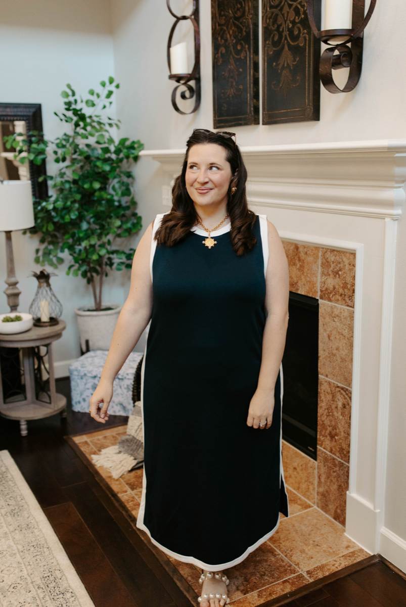 Solid sleeveless midi dress featuring contrast binding along neckline, armholes, and hem. Side slit at hem. Unlined. Knit. Non-sheer. Lightweight.