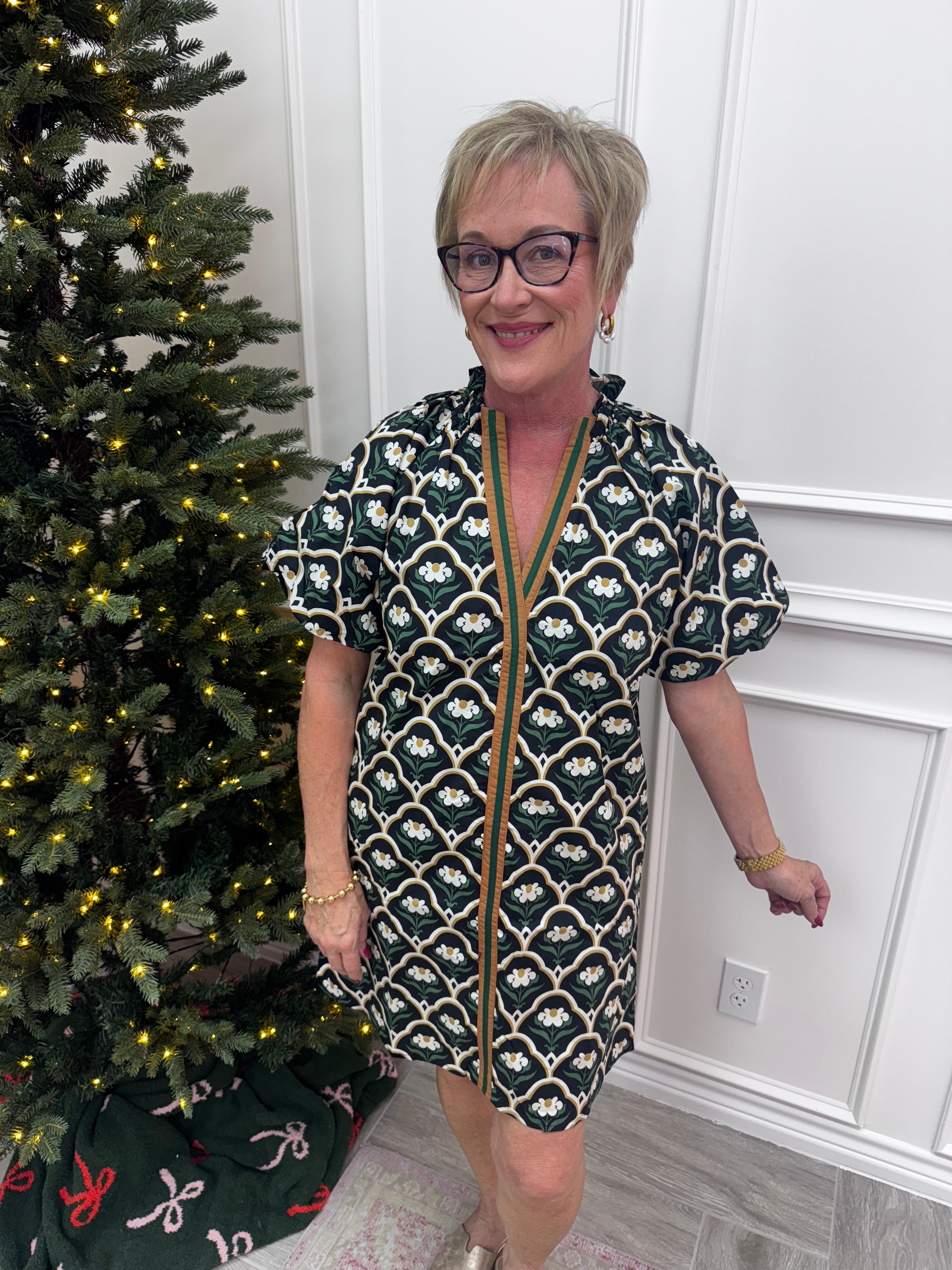 Step out in style with the Marlowe Dress, a playful botanical print mini dress that brightens any day. Its short puff sleeves and ruffled V-neckline add flirty charm, while multicolor contrast binding trims the design with a fun twist. Lightweight and lined, this woven dress feels as good as it looks. Bonus: side pockets to keep your essentials close while you twirl. Perfect for sunny adventures and breezy afternoons!