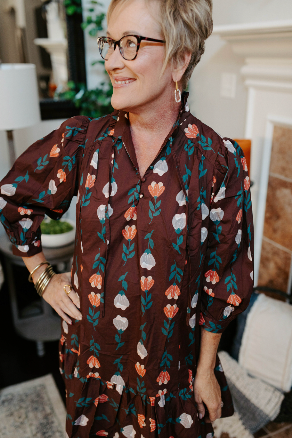Bring a burst of garden fun wherever you go with the Mocha Meadow Dress. This playful tiered mini dress features a lively multicolor floral print, a flirty split neckline with tie detail, and long sleeves with comfy elastic cuffs. The ruffled tiered hem adds extra twirl-worthy charm, and the fully lined design keeps you feeling comfortable all day long. Perfect for sunny days or casual nights out!