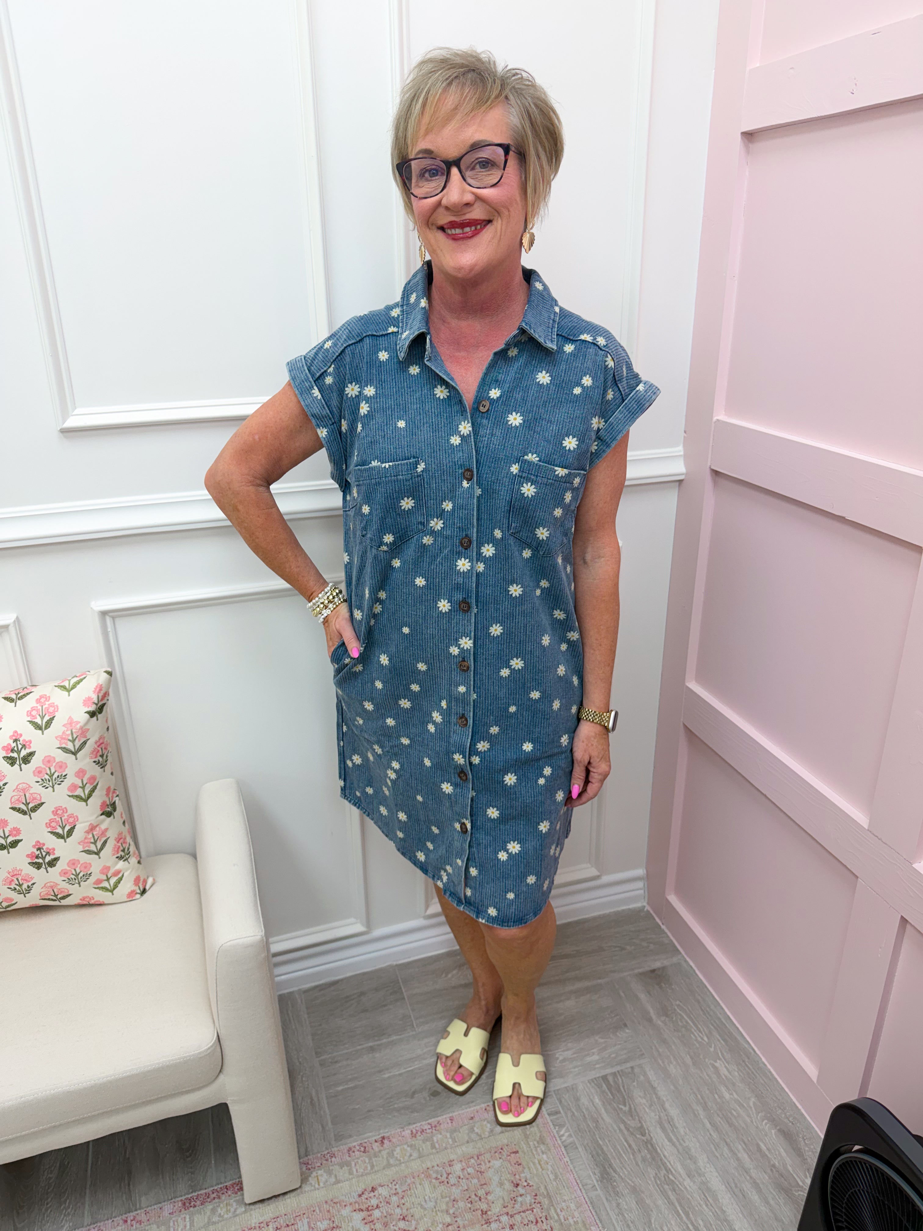 FOLDED CUFF BUTTON DOWN COLLARED FLOWERS PRINT DENIM SHIRT DRESS WITH POCKETS