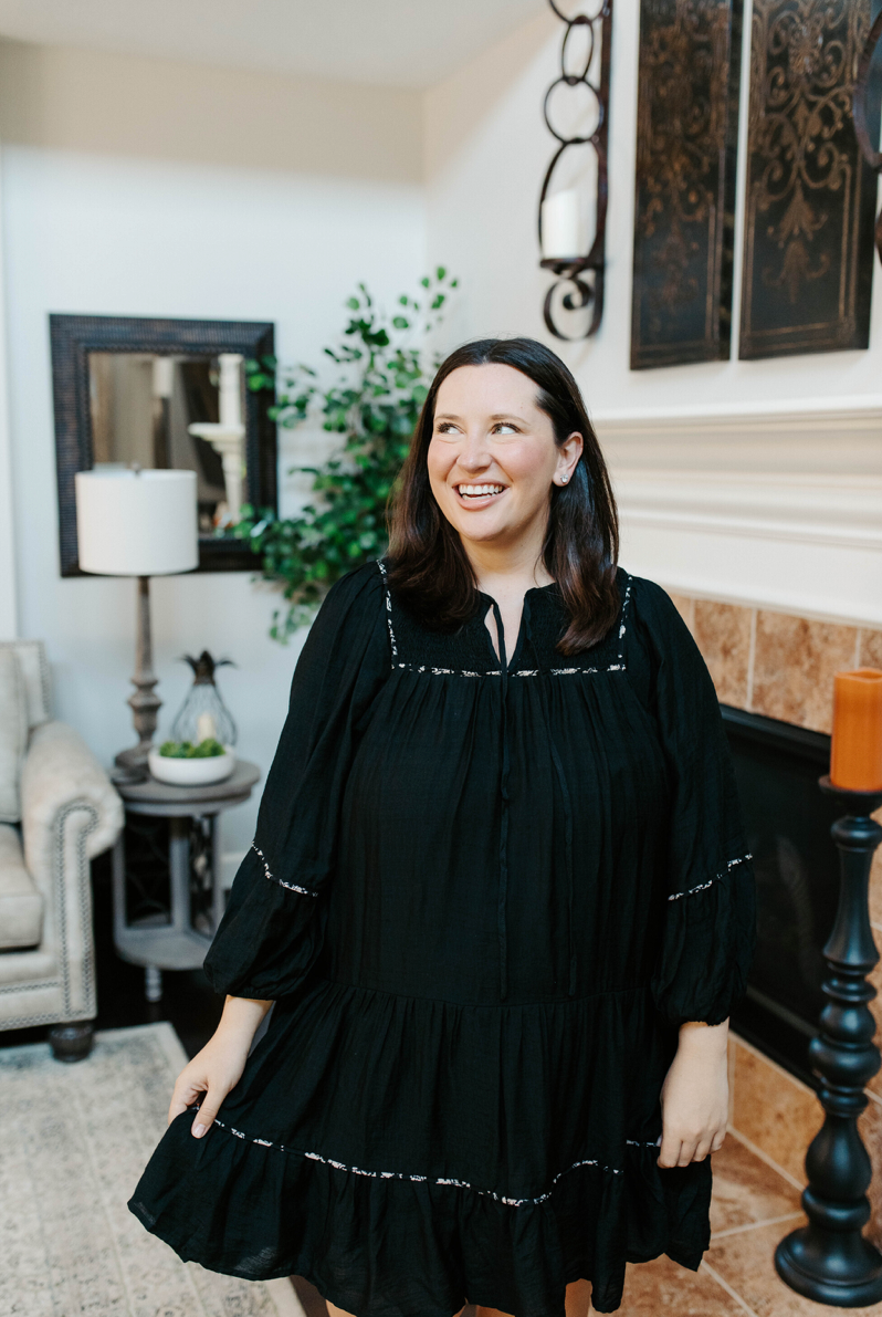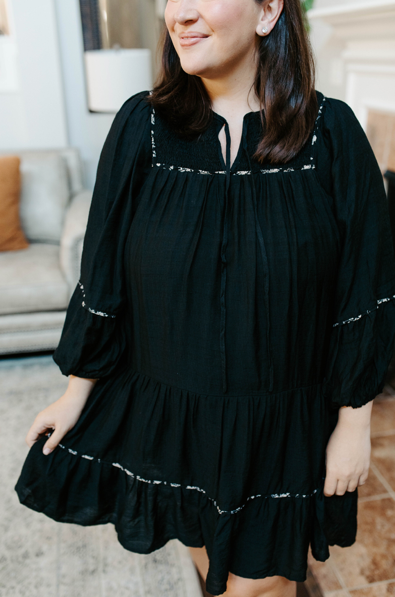 Embrace playful elegance with the Scalloped Dreams Dress. This flowy, tiered mini dress features a smocked square neckline with a charming V-notch and a front tie for a flirty finish. Delicate scalloped trim adds a whimsical touch, while the lining ensures comfortable wear all day long. Perfect for dancing through dreamy days and lively nights.