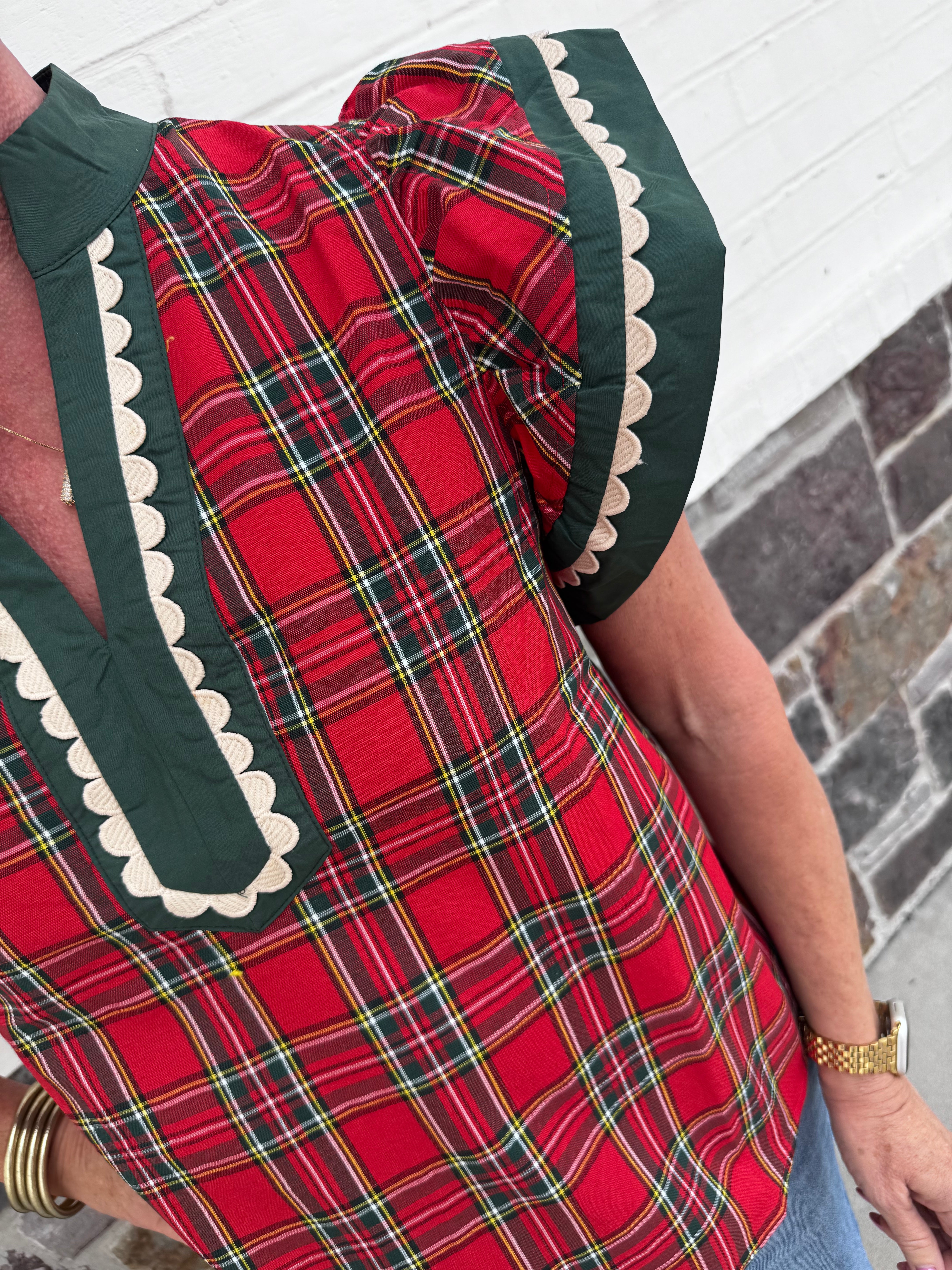 The Evergreen Eve top brings whimsy to your wardrobe with its playful plaid pattern and delicate scallop trim. Flutter sleeves add a breezy touch, while the contrast V-neck band inspired by caftan styles offers a fun twist. Lightweight and woven for comfort, it’s thoughtfully lined for perfect coverage without any sheerness, making it an easy favorite for any casual day or spirited outing.