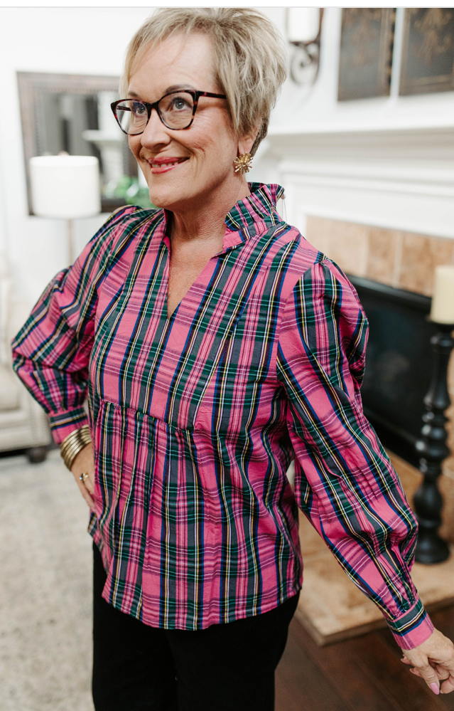 This top has a classic plaid pattern in a soft pink tone. A relaxed fit for all-day comfort, and a button-down front with a collared neckline. The Long sleeves with buttoned cuffs give a versatile look. Lightweight woven fabric suitable for various seasons, that is perfect for casual outings or layering under a jacket.