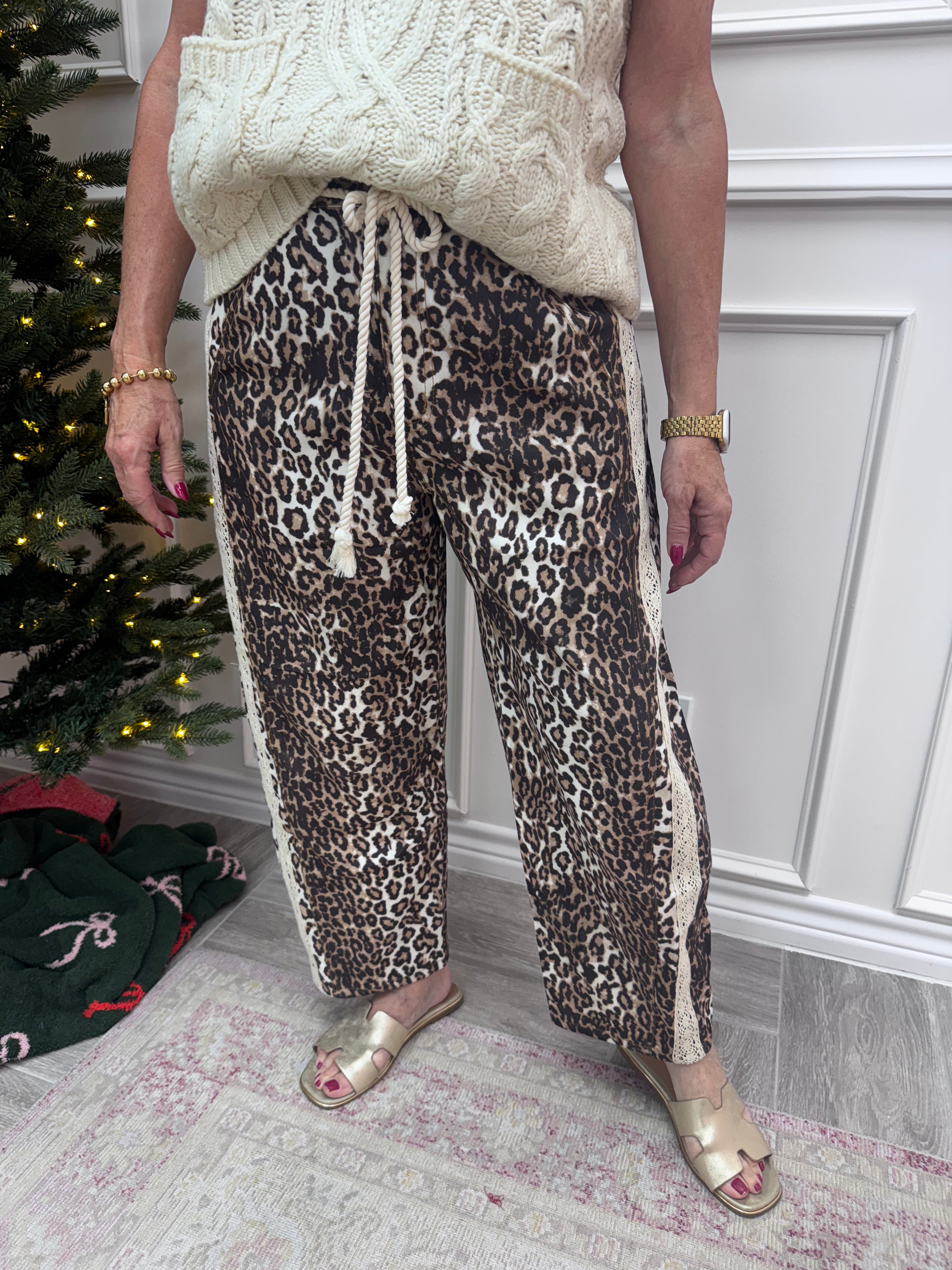 Unleash your wild side with the Leopard Lucy Pant! These relaxed cropped beauties feature an eye-catching leopard print that demands attention, paired with a comfy drawstring waist for the perfect fit. The contrast textured side panels add an unexpected twist that takes these pants from basic to bold. Whether you're running errands or making a statement, Lucy's got the style to keep up with your vibe.