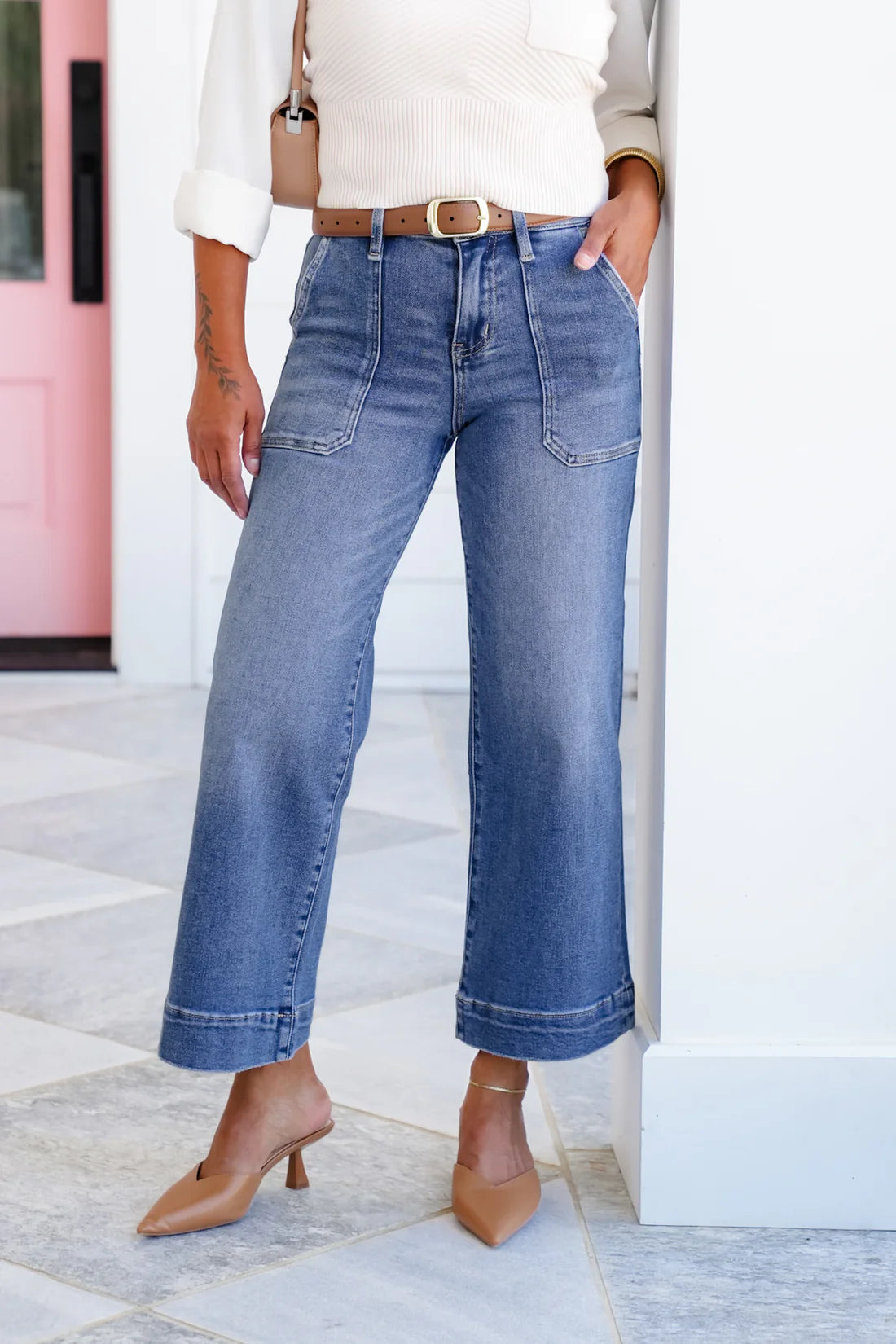These Lovervet wide leg jeans are where polish meets comfort. The high rise design gives a flattering fit through the waist and hips, while the wide leg silhouette flows into a clean trouser hem that instantly elevates your outfit. The utility pocket detail adds just the right amount of edge without sacrificing versatility.