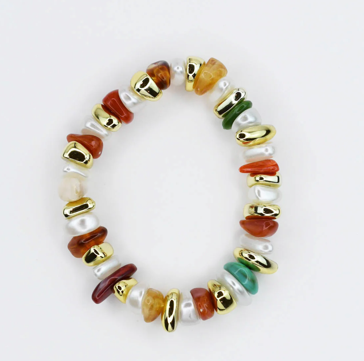 Slip on this stretchy bracelet and let those gorgeous fall-inspired beads do the talking! Featuring lustrous pearl accents paired with warm, seasonal hues, it's the perfect pop of color for your wrist. The gold touches add just enough sparkle to keep things fun and fabulous. Easy to wear, impossible to resist—this is the bracelet that makes every outfit feel like a celebration!