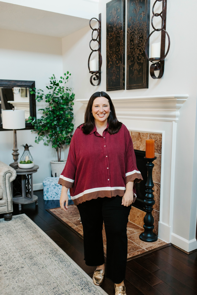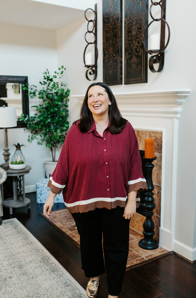 Add a splash of fun to your wardrobe with the Abigail Merlot Trim Top. Crafted from breathable linen, it features a bold colorblock hem and cuffs that catch the eye. The classic shirt collar and wide, flowy sleeves offer effortless style and comfort, while the playful scalloped hem adds a charming twist. Button down for a relaxed yet polished look that's perfect for any casual adventure. Unlined for a light, breezy feel all day long.