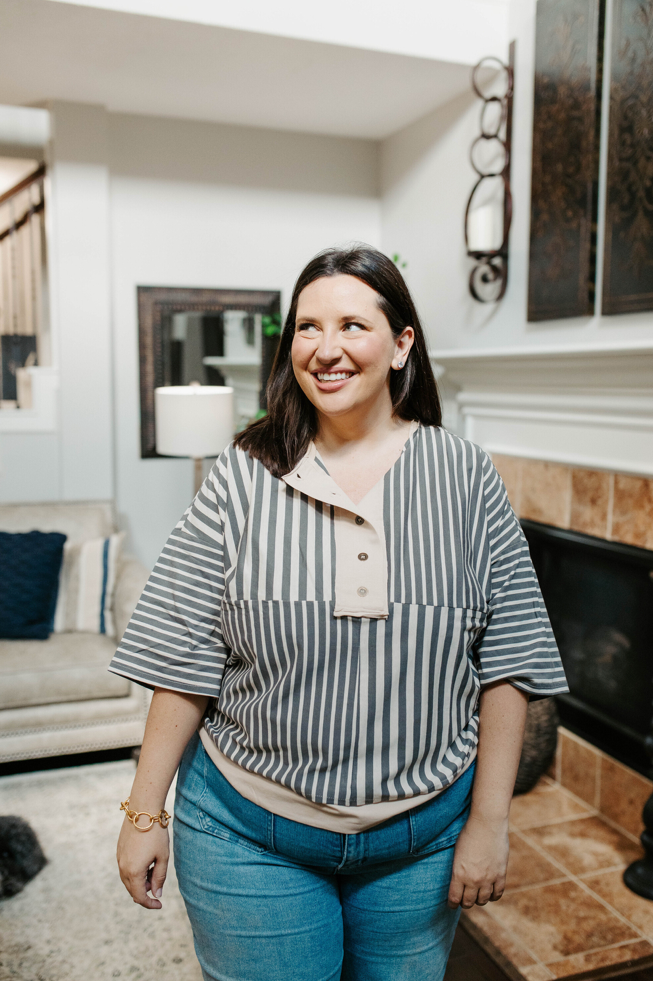 Get ready to turn heads in the Angel Knit Striped Top! This boxy knit features a sleek buttoned front and eye-catching directional stripe panels that add a fun twist to your look. Perfect for mixing comfort with a dash of style, it’s your go-to top for playful, everyday flair.