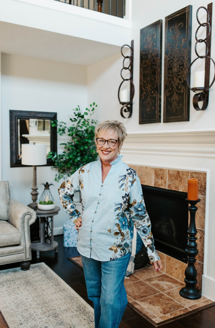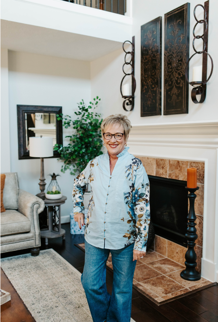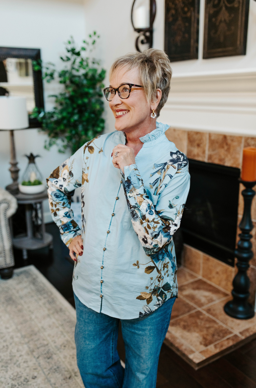 Bring a touch of whimsy to your wardrobe with the Blue Orchard Top. This lightweight woven shirt features playful floral accent sleeves and a ruffle-finished V-neck with button closure for a flirty flair. Non-sheer and unlined, it offers comfort and effortless style for any sunny day.
