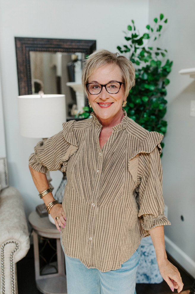 Embrace effortless charm with the Easily Loving You Top. Crafted from soft, mineral-washed stripe cotton gauze, this button-down blouse features playful 3/4 sleeves and elasticized cuffs for a comfy fit. The V-neckline is adorned with a delicate ruffle trim, while front pleats add a flirty touch. Perfect for days when you want to feel light, breezy, and effortlessly stylish.