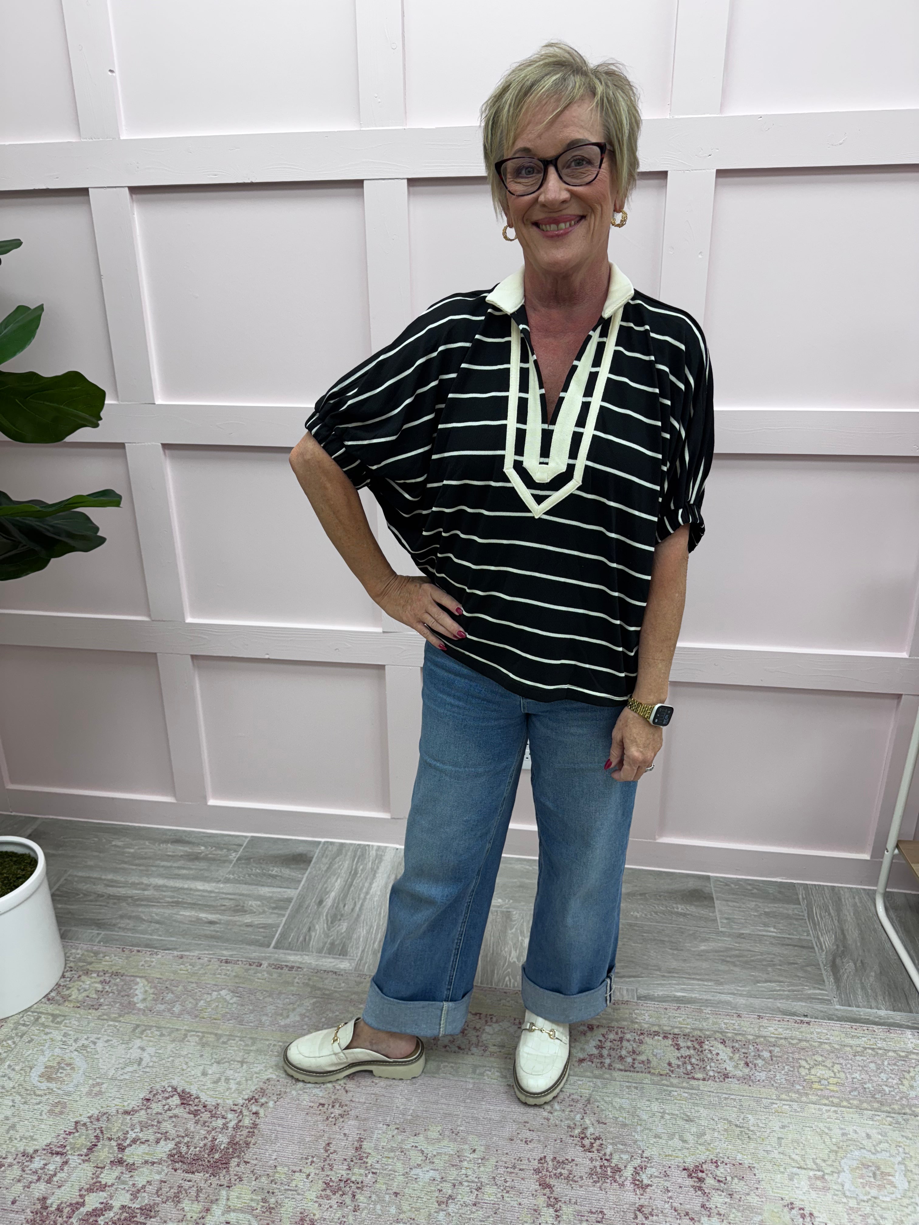 Meet your new favorite: the Effortless Lines Top! This striped short dolman sleeve gem brightens any outfit with its contrast trim split V-neck. Lightweight knit fabric keeps you cool and comfy, while elasticated sleeve openings add a fun, flirty touch. Unlined and non-sheer, it’s perfect for breezy days when easy style is a must.