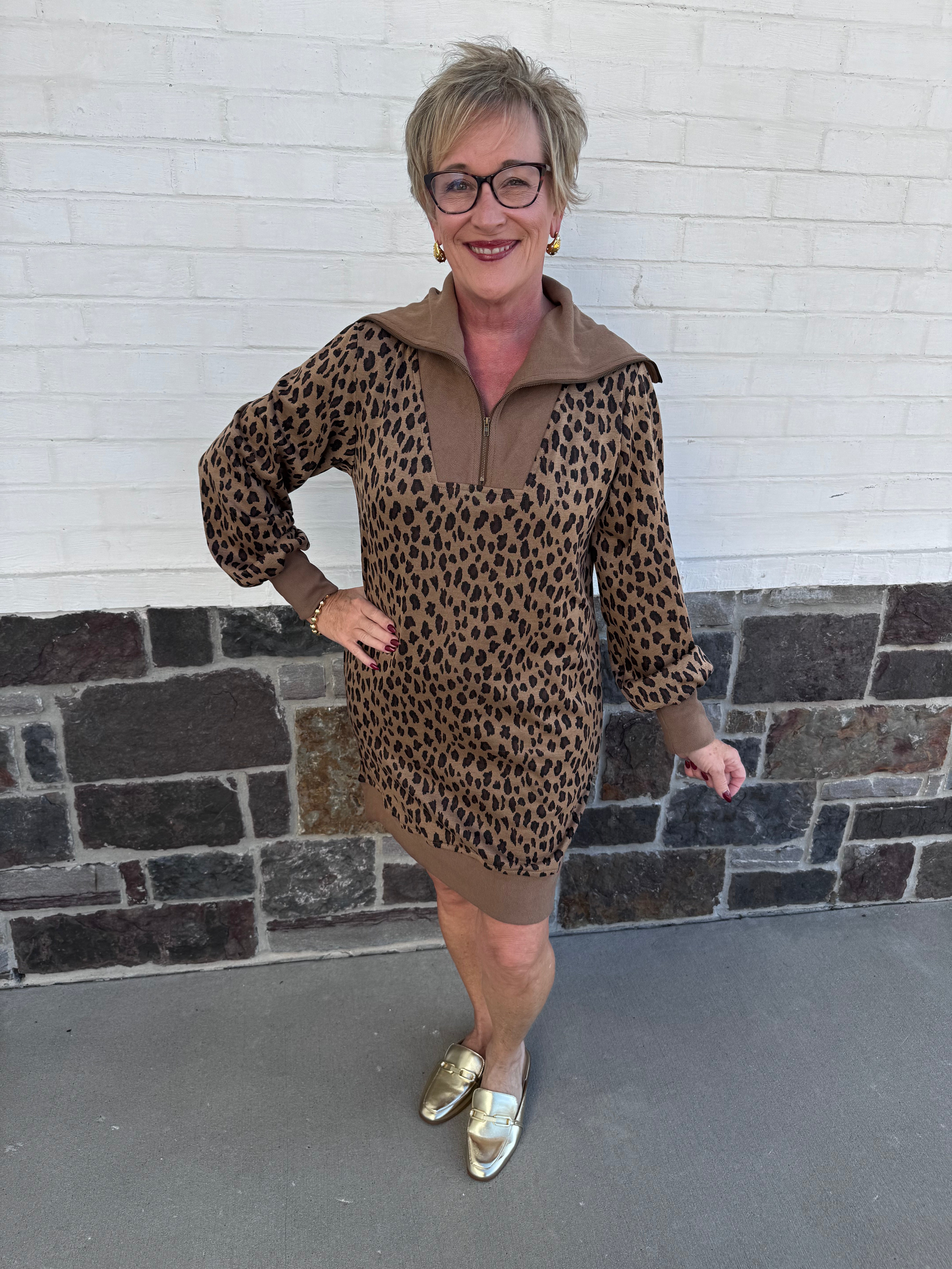 Turn heads effortlessly in the Leopard Ease Dress, featuring a chic half-zip collar and playful balloon sleeves. The jacquard fabric adds a textured touch, while the bold leopard print brings out your fierce, fun side. Perfect for days when you want comfort with a splash of wild style!