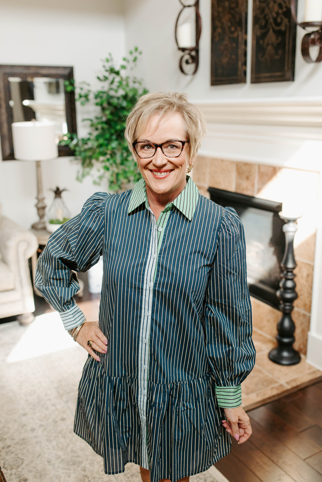 Step into charm with the Southern Sally Dress, featuring playful navy, green, and blue stripes that brighten your day. Its long sleeves and crisp collar add a touch of classic contrast, making it perfect for any occasion where fun meets style.