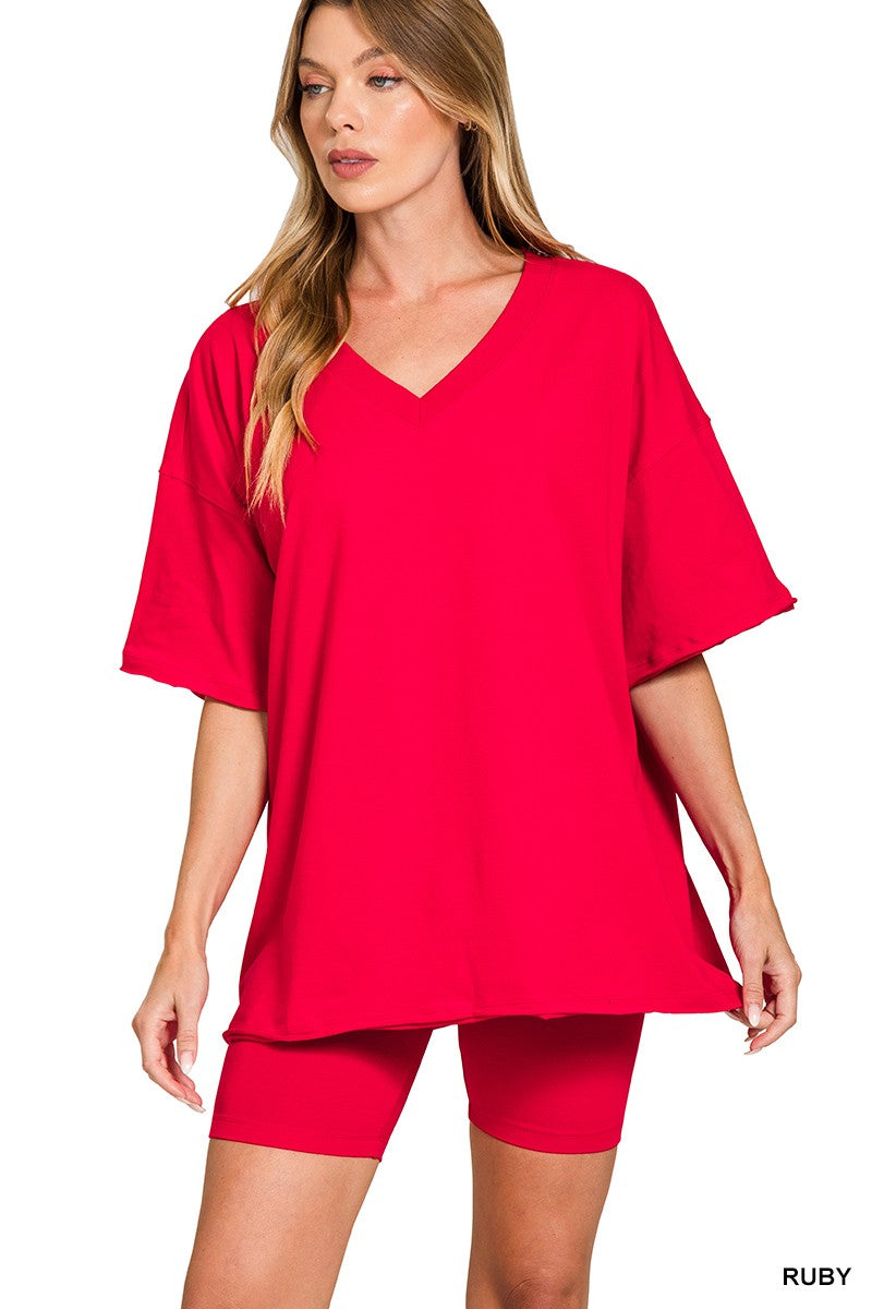 Get ready to rock your weekend in the Sunday Staple Set! This playful duo pairs a comfy cotton V-neck raglan sleeve top with chic raw edges and sleek biker shorts made for movement and style. Perfect for lounging or hopping out for errands, it’s your new go-to for effortless cool and cozy vibes.