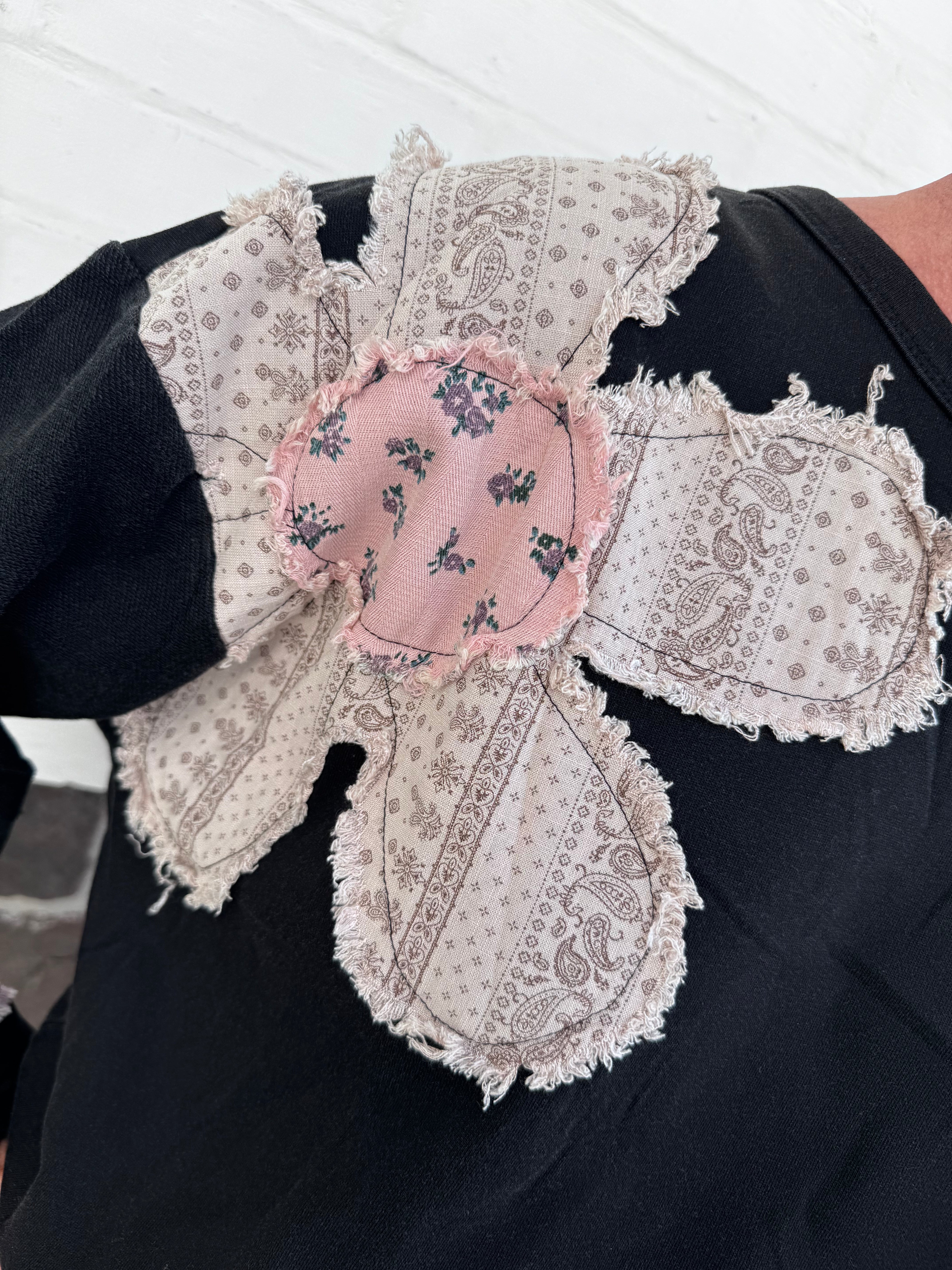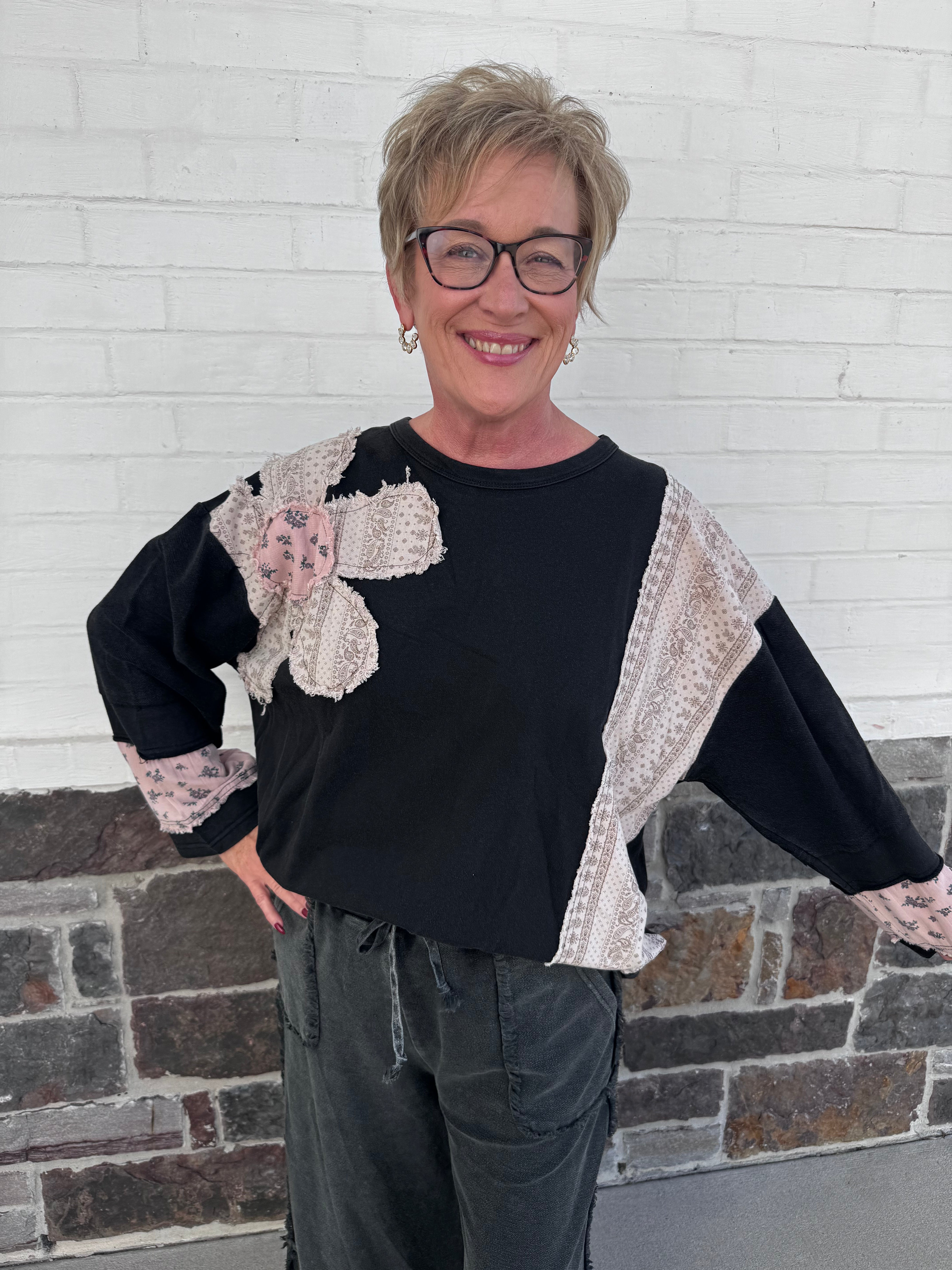 The Boho Patch Top is a playful French Terry pullover with a relaxed fit and a unique mineral wash for extra softness. Featuring contrasting floral and paisley patchwork, its long, wide sleeves add a fun, breezy vibe to your look. Lightweight and unlined, this top is perfect for layering or wearing solo to brighten up any casual day with effortless style.