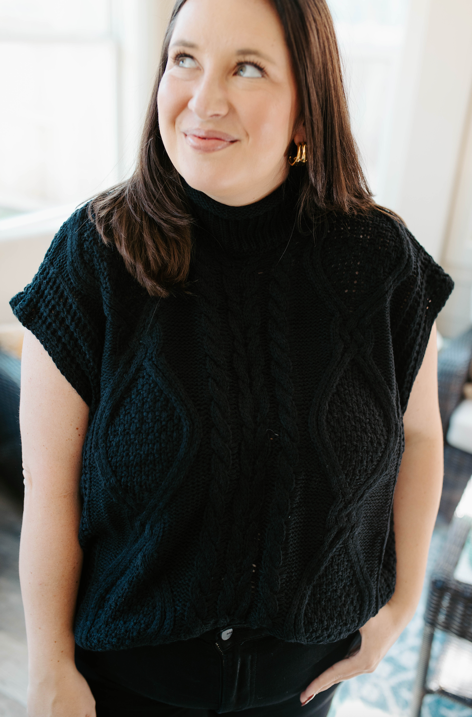 Get ready to chill in style with our Here To Hangout Sweater! This sleeveless, drop shoulder mock neck top brings easygoing vibes and cozy comfort together. Perfect for layering or wearing solo on laid-back days, it’s your go-to piece for effortless cool and playful charm.