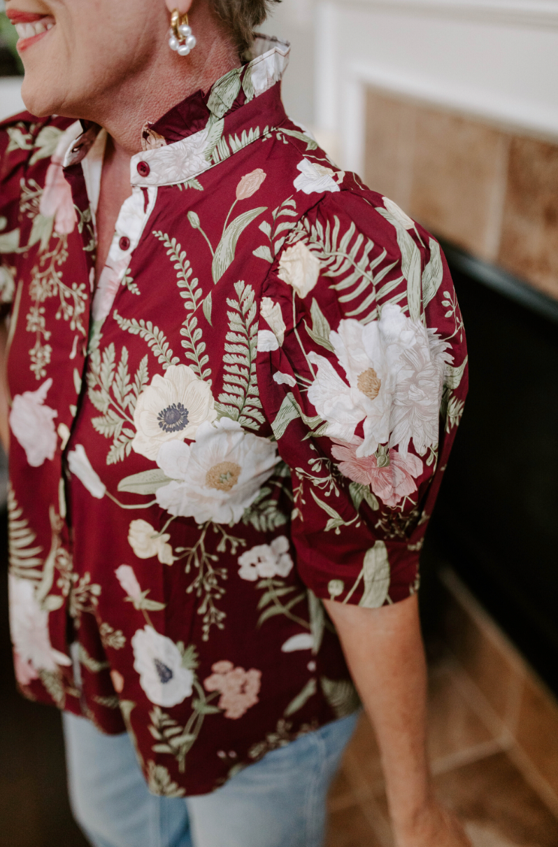 Bloom with charm in our Maple Garden Top! This playful piece features a delicate floral print and feminine ruffled neckline that frames your face beautifully. The button front adds vintage appeal, while pleated puff sleeves bring the perfect touch of whimsy. Crafted from lightweight, non-sheer woven fabric, this unlined top is ready for sunny day adventures!