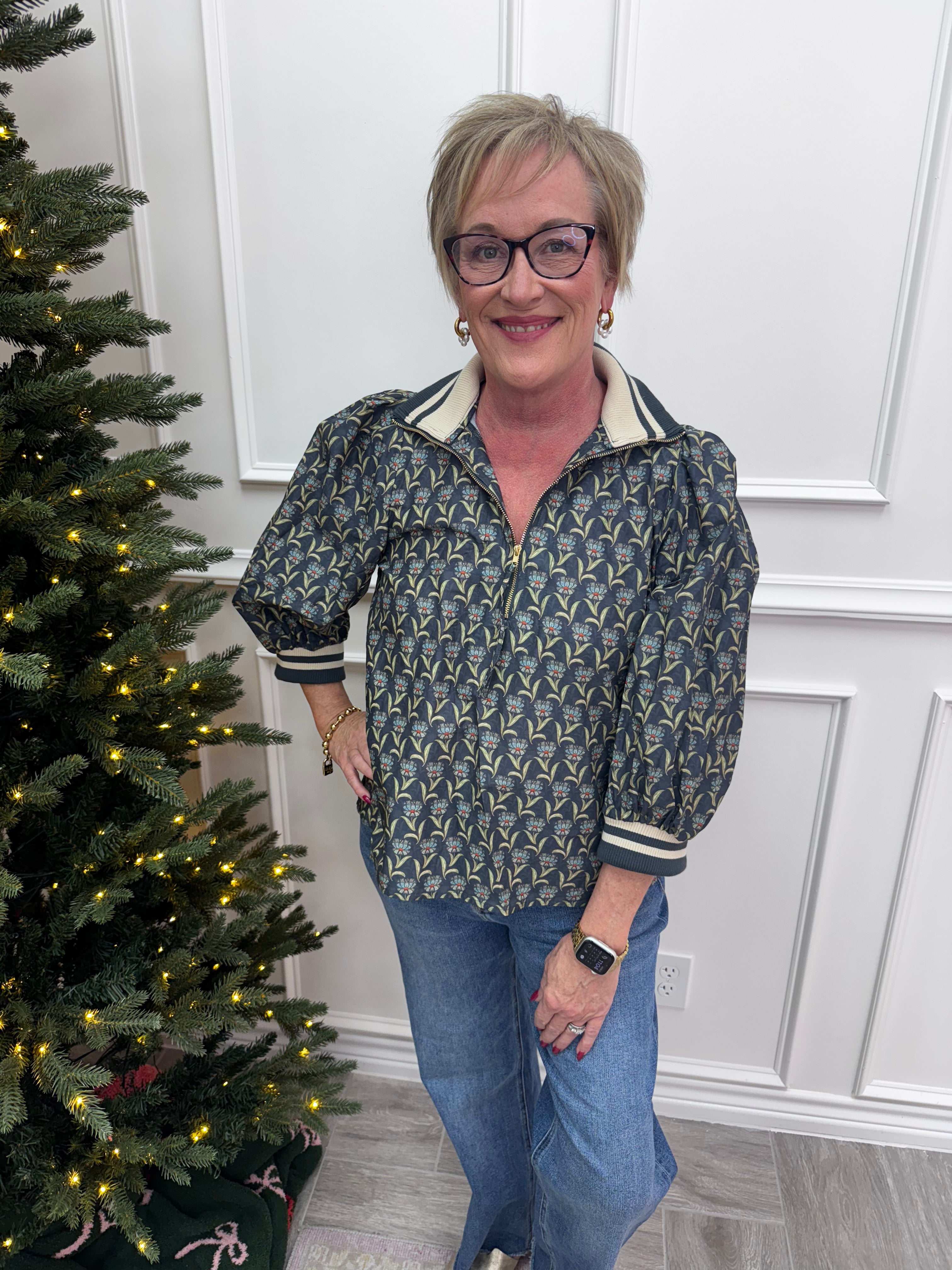 Brighten your day with the Meet Me At The Market Top! This playful floral print blouse features charming 3/4 puff sleeves and a half-zip front for easy style. The contrast stripe ribbed stand collar and cuffs add a fun pop of color, while the lightweight woven fabric keeps you comfortable and cool. Unlined and non-sheer, it’s perfect for a casual outing or a market adventure with friends.
