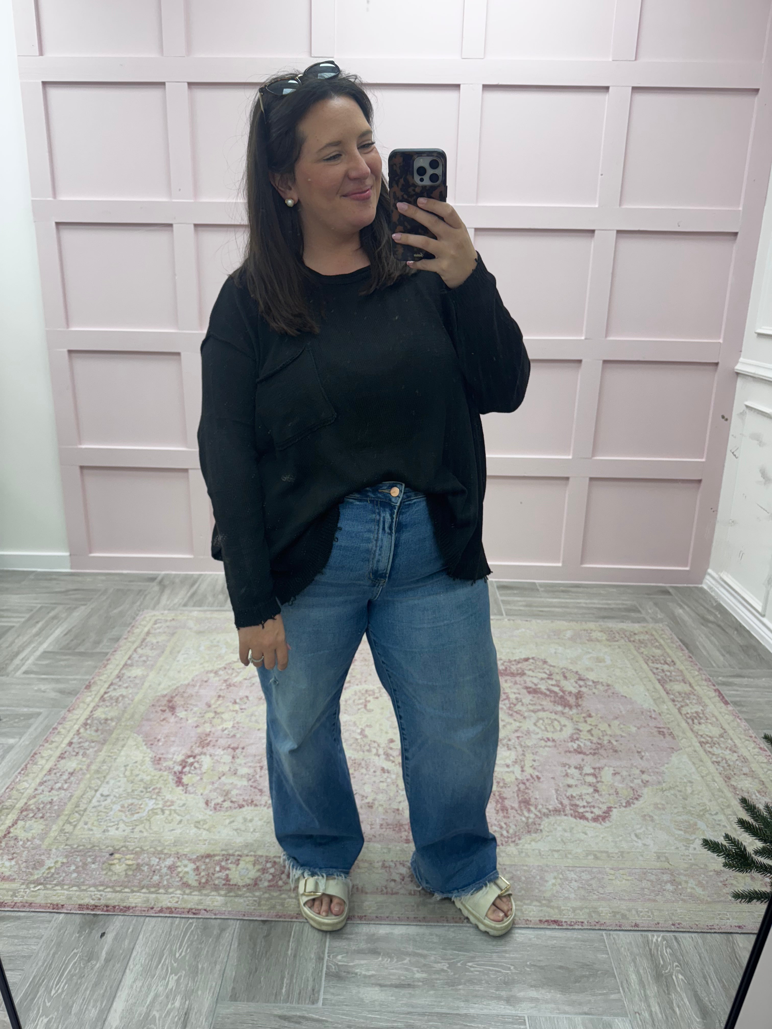 The Oaklyn Knit Sweater is your new go-to for cozy-chic vibes. This oversized long-sleeve beauty features a relaxed fit that's perfect for layering or wearing solo, complete with a wide, rolled crew neck that screams effortless style. Practical details like the chest pocket and side slits add function to the fun, while ribbed cuffs keep things polished. Raw edge seams give it that intentionally undone look we're all obsessed with. Comfort meets cool in this knitted essential.