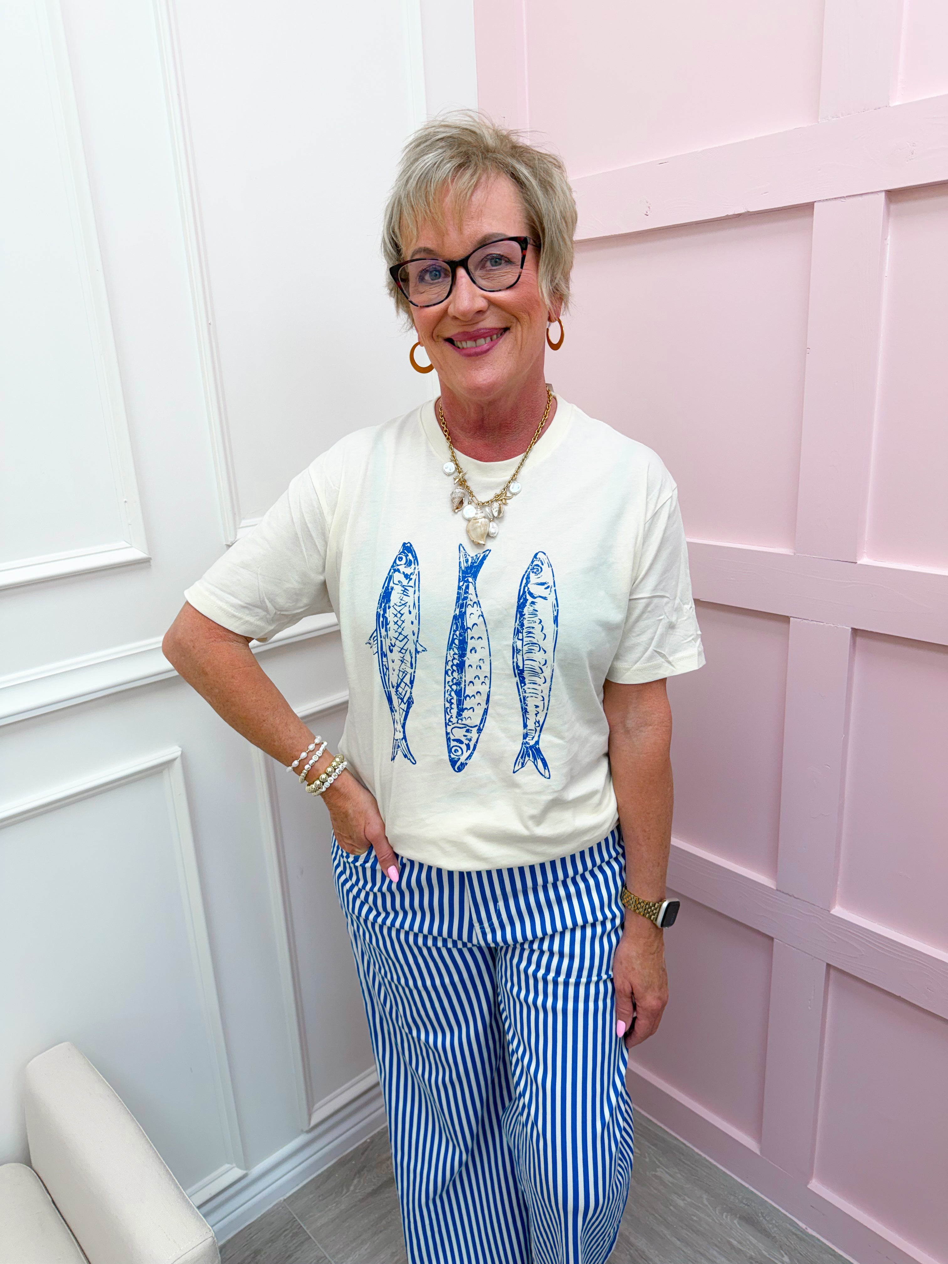 Make a splash with the Reel Cute Tee, where whimsical fish graphics meet everyday comfort. This short sleeve crew neck tee features soft, breathable fabric that keeps you cool and cozy all day long. The relaxed fit pairs effortlessly with denim, shorts, or lightweight layers for a laid-back look that works year-round. Perfect for anyone who loves a little personality in their wardrobe—because life's too short for boring basics.