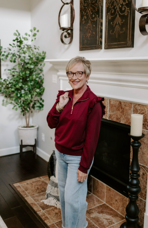 Elevate your casual look with the Ruffle Run Pullover, crafted from soft Luxeknit for cozy comfort. This playful quarter-zip features charming ruffle details on the shoulders and scalloped edges that add a flirty touch. With long sleeves and a lightweight, unlined design, it’s perfect for layering or wearing on its own during breezy days.