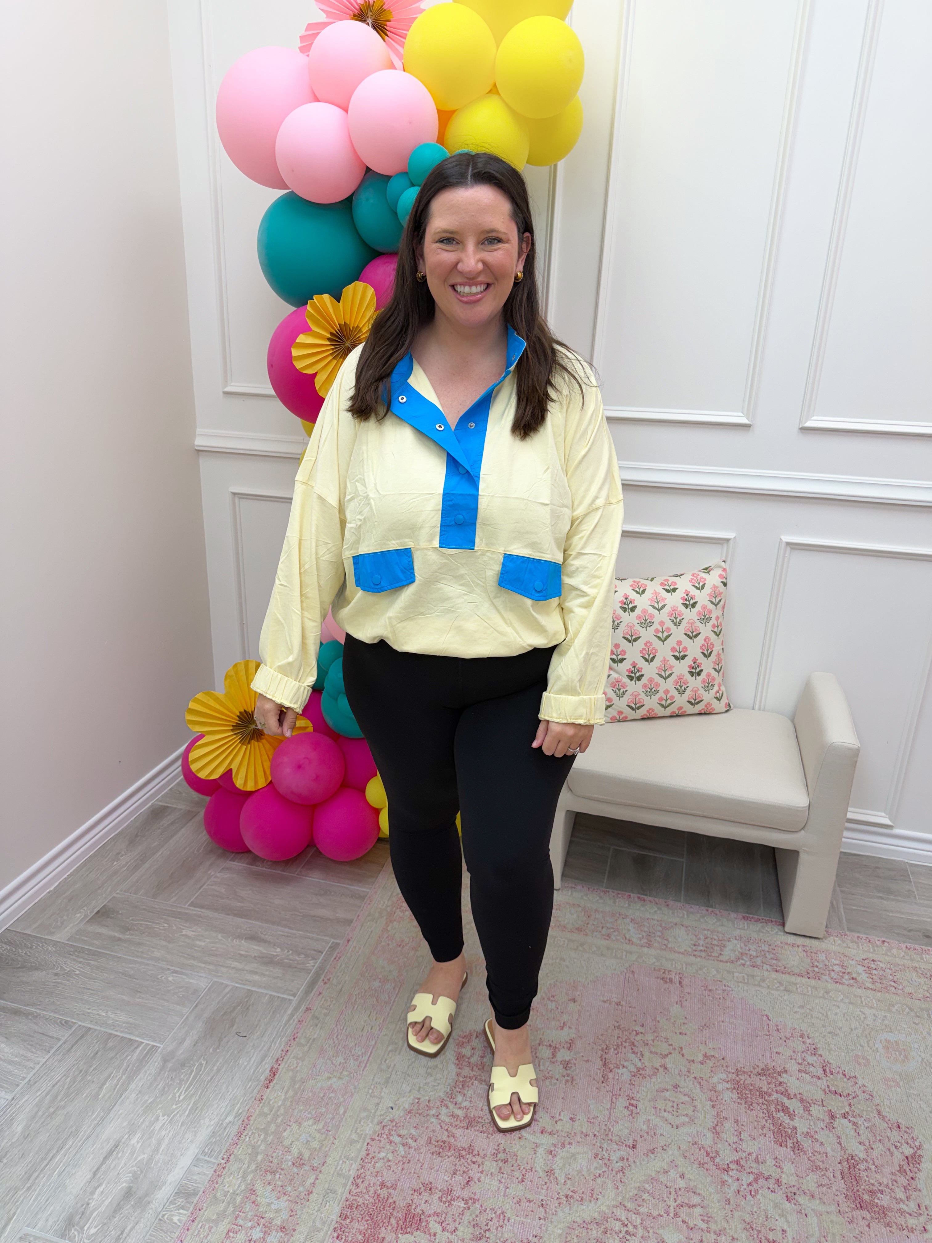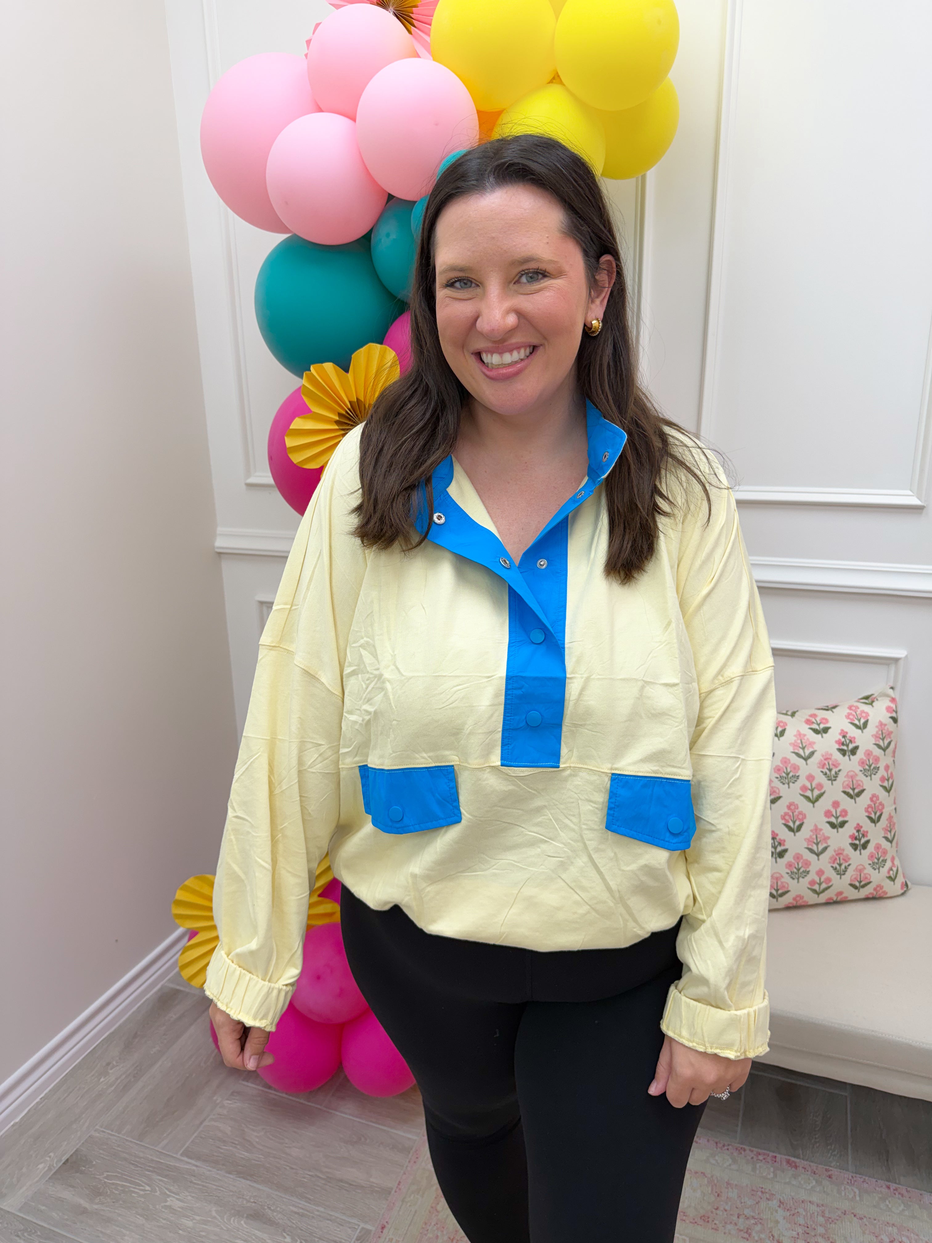 Sunshine Snap Pullover Layer up with effortless style in this cozy contrast-trim sweatshirt. The snap-button half placket makes it easy to adjust your vibe, while functional flap pockets keep your essentials close. Elastic cuffs and hem lock in warmth without the bulk. Perfect for those days when you want comfort that actually looks good—no compromises needed.