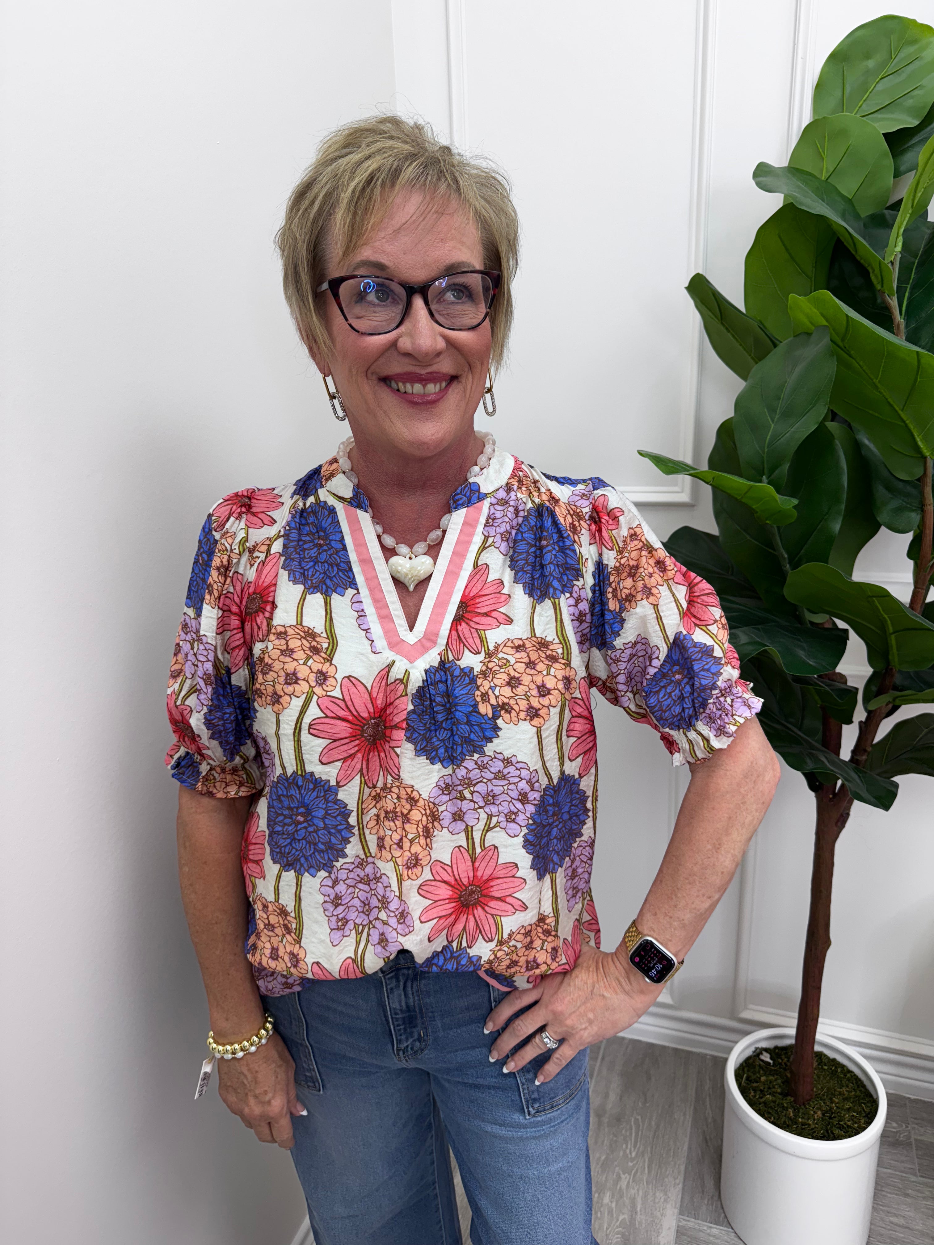 Bloom into spring with this charming floral print top! The split V-neckline features a striped trim detail that adds visual interest, while short puff sleeves with elastic hems create a sweet, feminine silhouette. Lined for comfort and confidence, this piece pairs perfectly with your favorite bottoms for effortless style. The contrast details elevate the playful print, making it an instant wardrobe favorite.