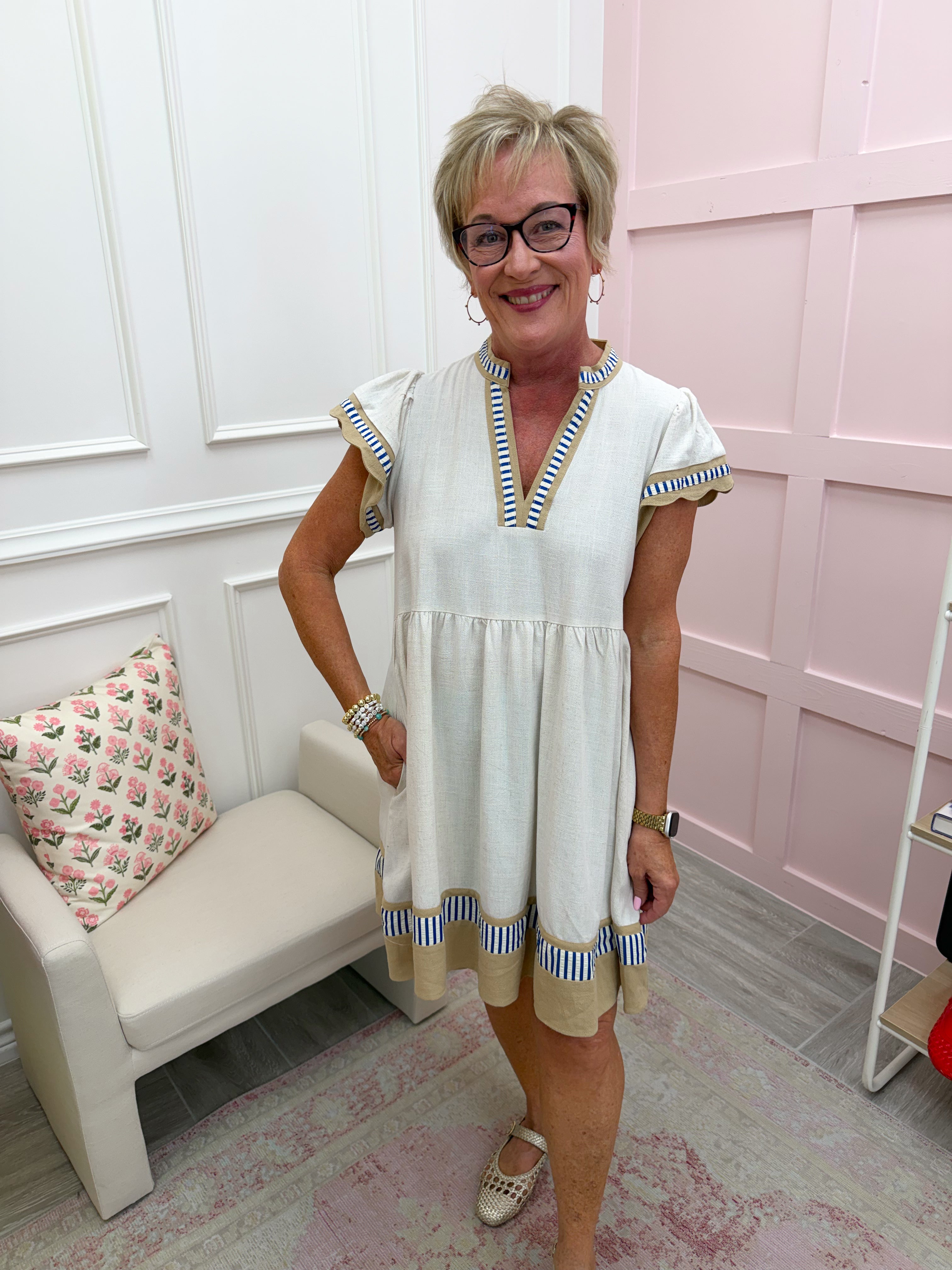 Linen Color Block Flutter Sleeve Dress