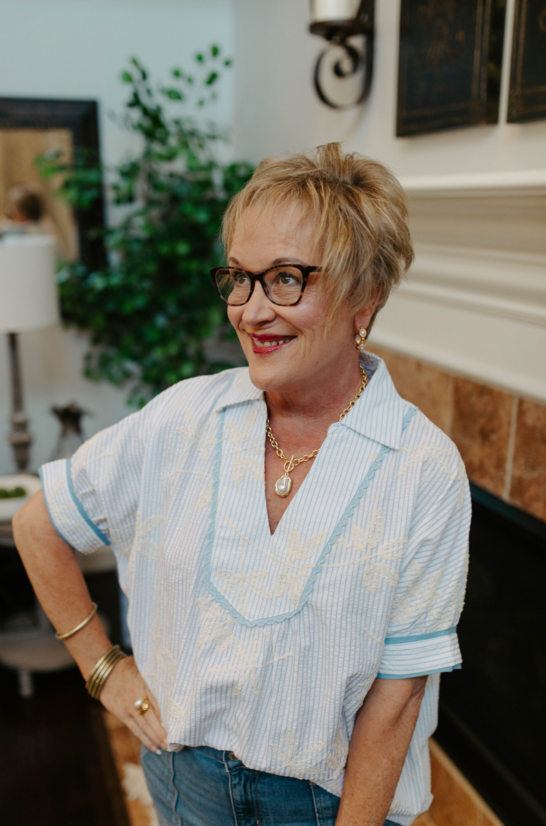 Effortlessly charming, this striped blouse brings vintage-inspired details to your everyday rotation. The split V-neck features delicate scallop trim, while short cuffed sleeves and lace accents add a touch of whimsy. With an embroidered design and relaxed fit, it's the kind of piece that feels like a wardrobe staple the moment you slip it on. Perfect for pairing with your favorite bottoms for a look that's both polished and playfully put-together.