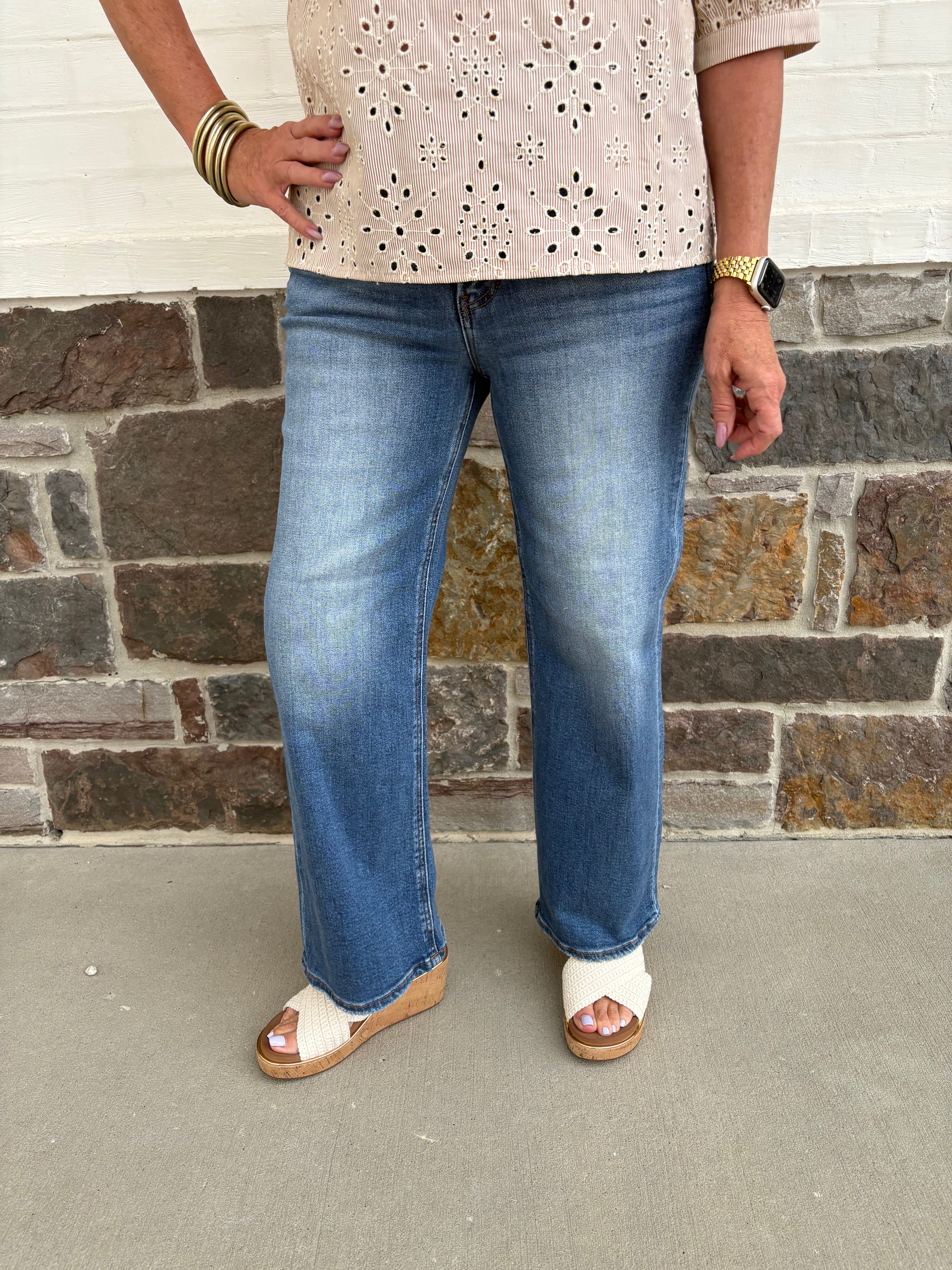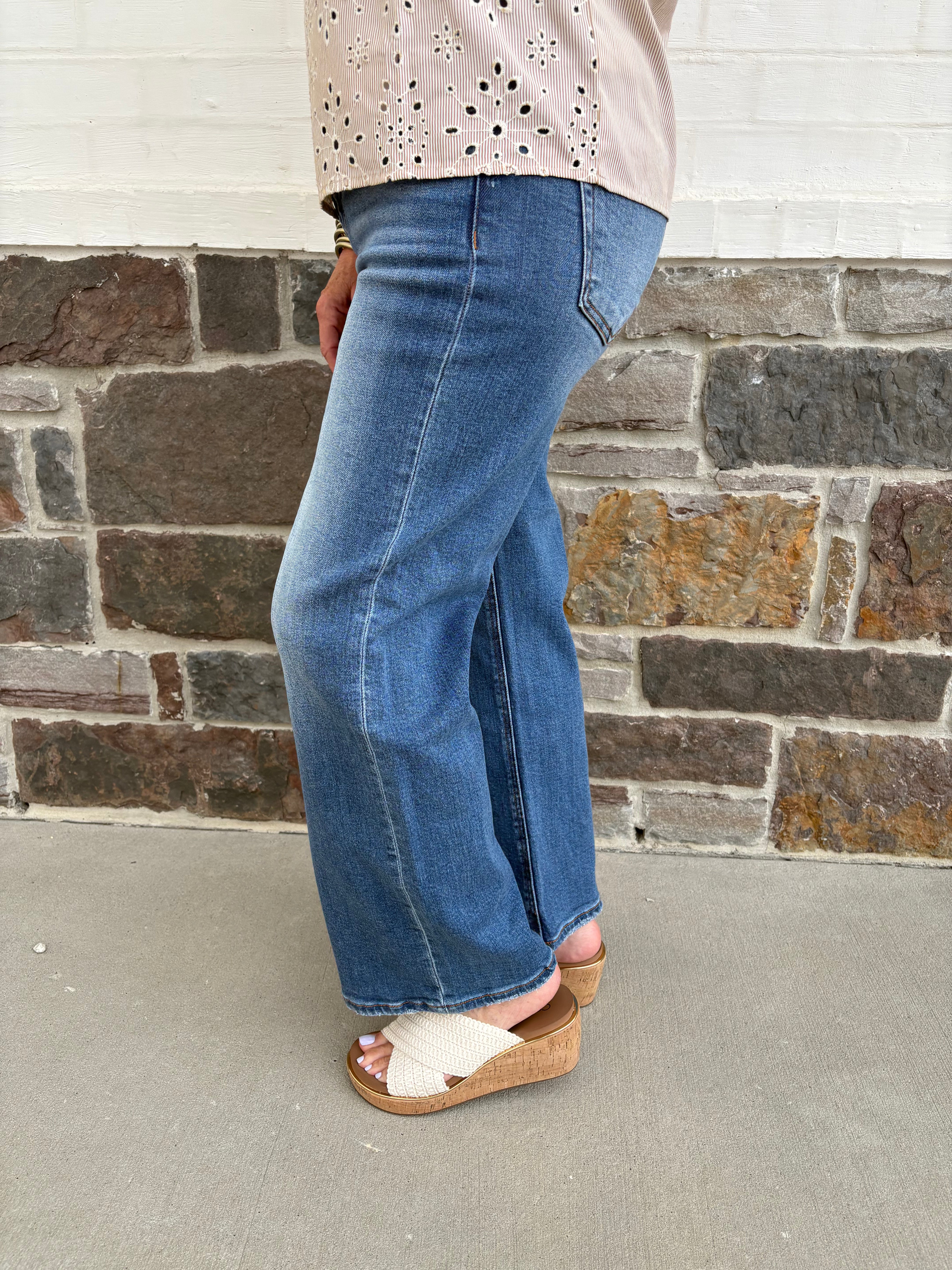 Step into style with the Risen Mid Rise Crop Wide Leg Jean in a rich dark wash. These jeans offer a fun, flirty silhouette with their cropped length and wide leg cut, perfect for showing off your favorite shoes. The mid-rise fit keeps things comfy and flattering, making them your go-to for casual days or weekend adventures. Embrace effortless cool with a playful twist!