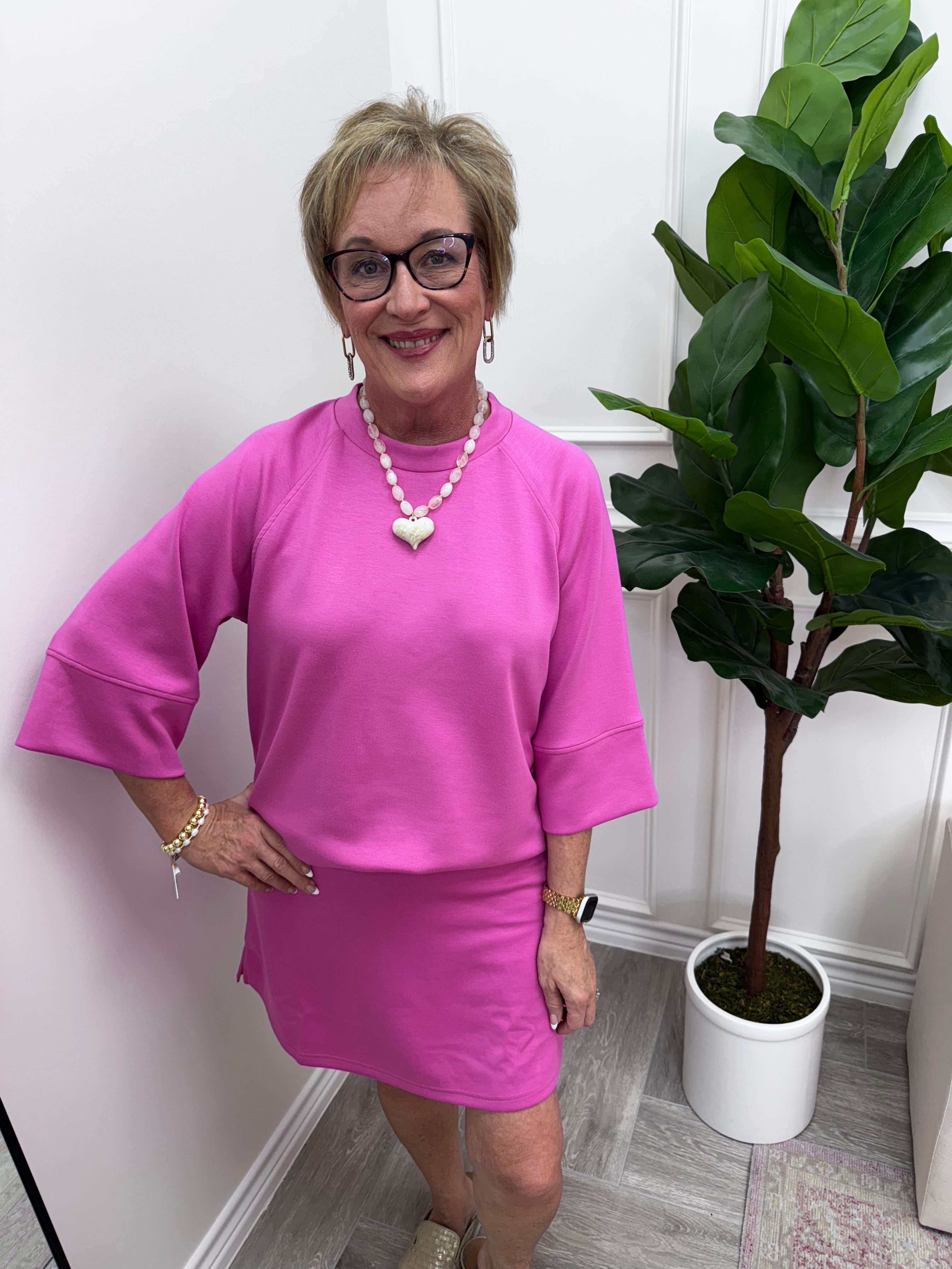 The Uptown Luxe Skort is your new go-to for effortless style. Crafted from premium Luxeknit material, this skort features built-in shorts for worry-free movement and a subtle side slit that adds just the right amount of edge. The pull-on design means zero fuss getting ready, while the lined shorts keep you comfortable all day long. Whether you're heading to brunch or running errands, this piece delivers both sass and sophistication.