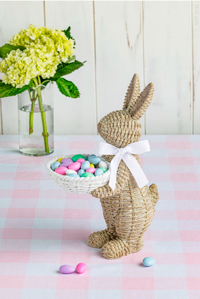 Wicker-style resin bunny holding a candy dish comes tied with grosgrain ribbon at neck.